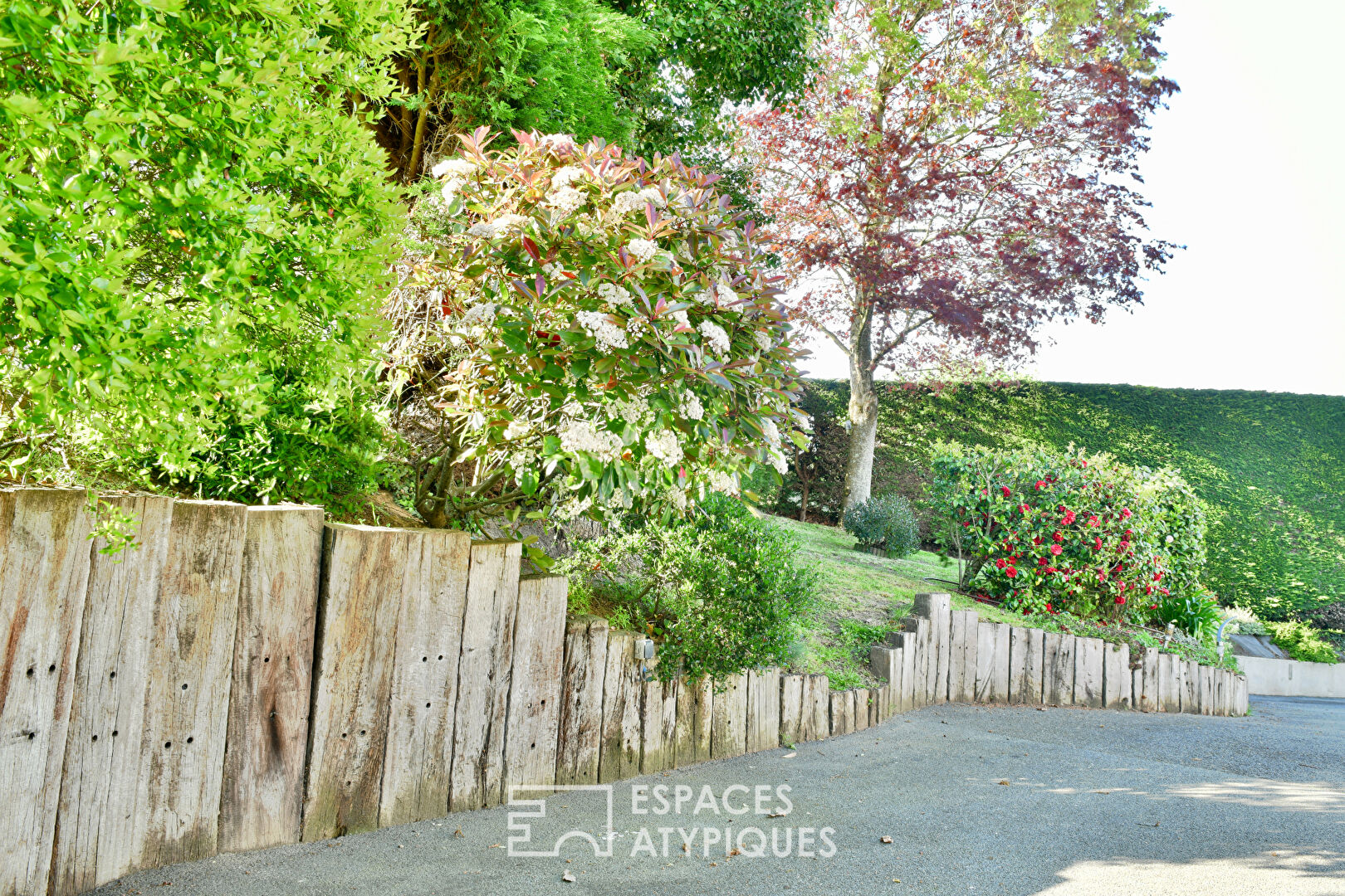 Cet espace est baigné de lumière grâce à de grandes baies vitrées avec vue sur la nature, les arbres dont des pins.