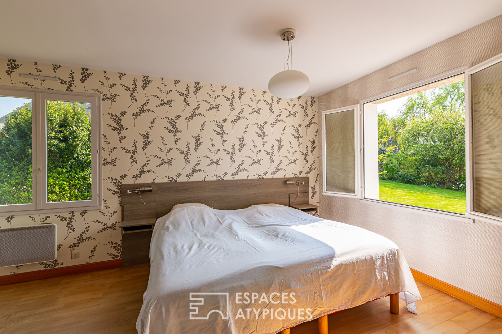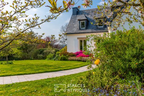 -EXCLUSIVITE ESPACES ATYPIQUES- Le superbe jardin paysagé de massifs fleuris et d’arbres aux essences variées offre un merveilleux décor à cette élégante maison néo-bretonne.
