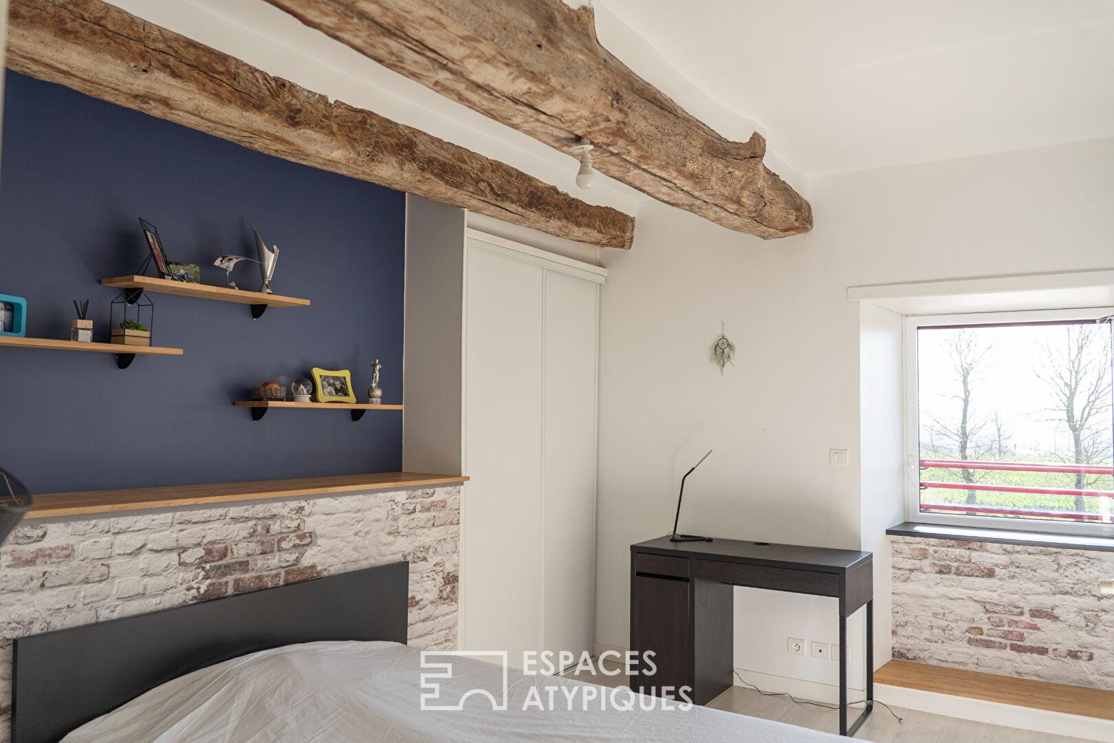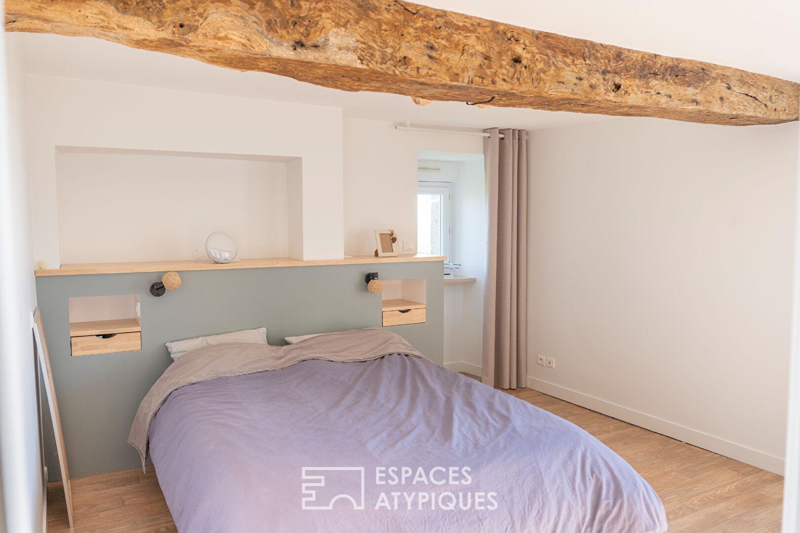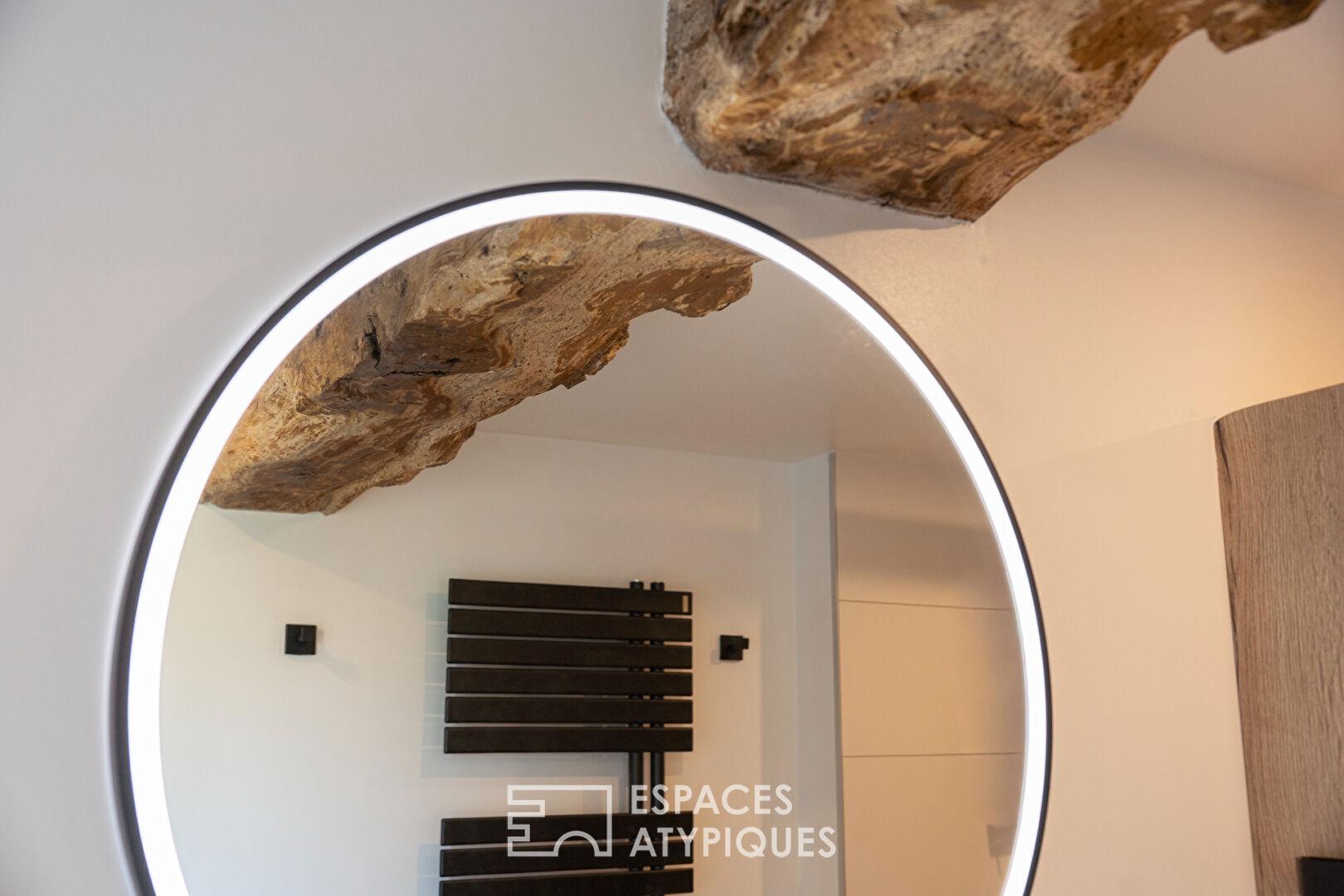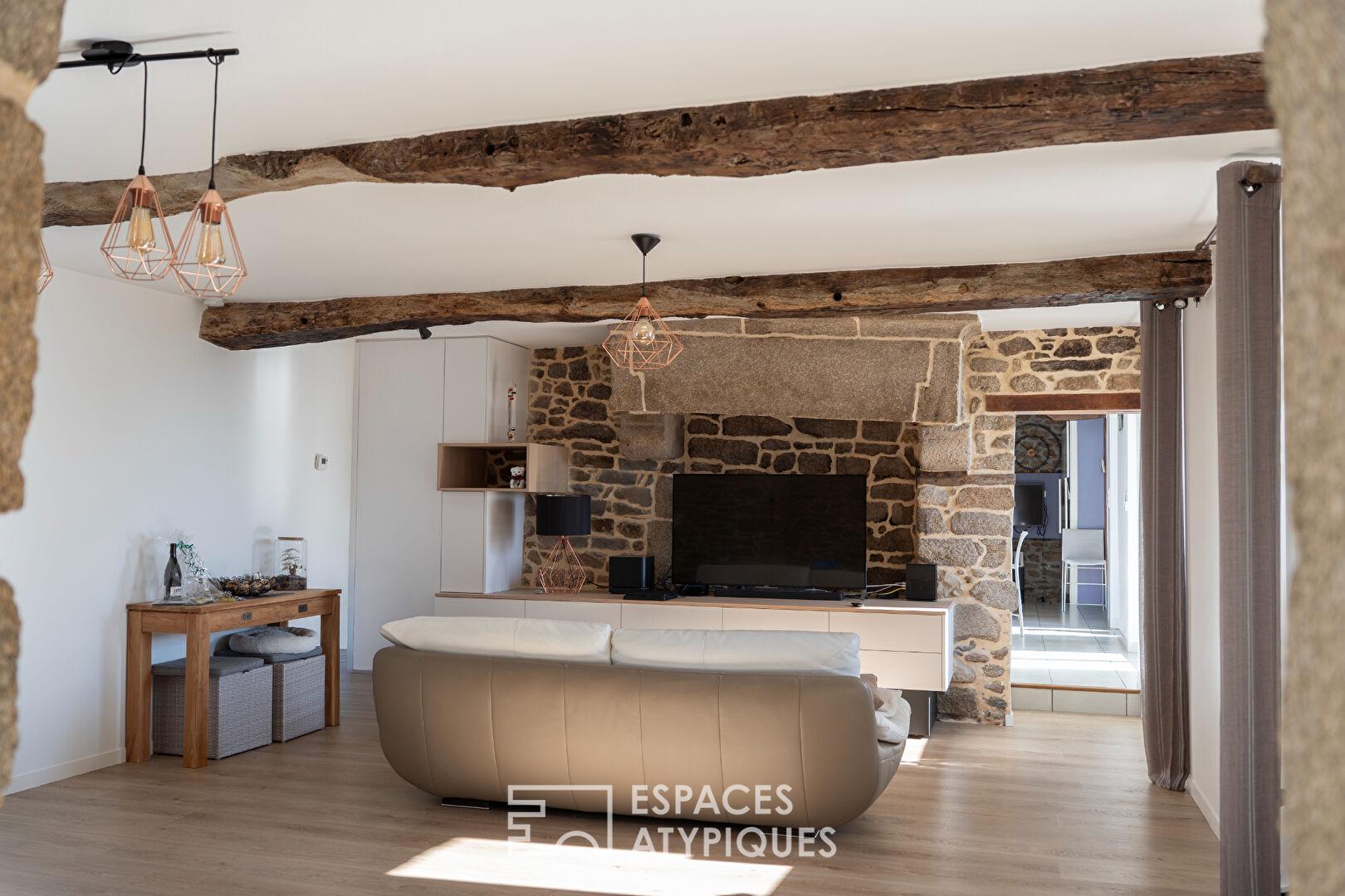 Le rez-de-chaussée dévoile un bel espace de vie lumineux, rythmé par de belles poutres en bois séculaires, des murs en pierre apparentes et d’une imposante cheminée en pierre repensée et aménagée sur mesure.