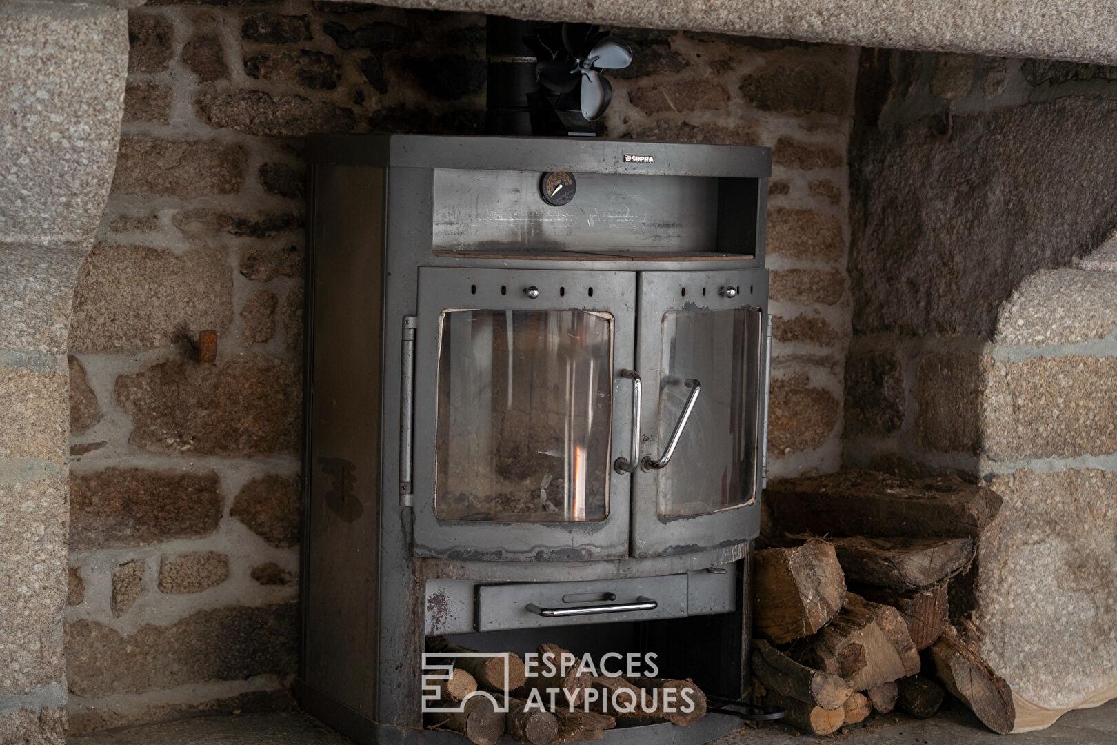 La cuisine s’articule autour d’un îlot central convivial. Spacieuse et bien agencée, elle permet à toute la famille de s’y retrouver en toute convivialité. Elle dispose également d’une cheminée avec poêle à bois, ajoutant une touche d’authenticité.