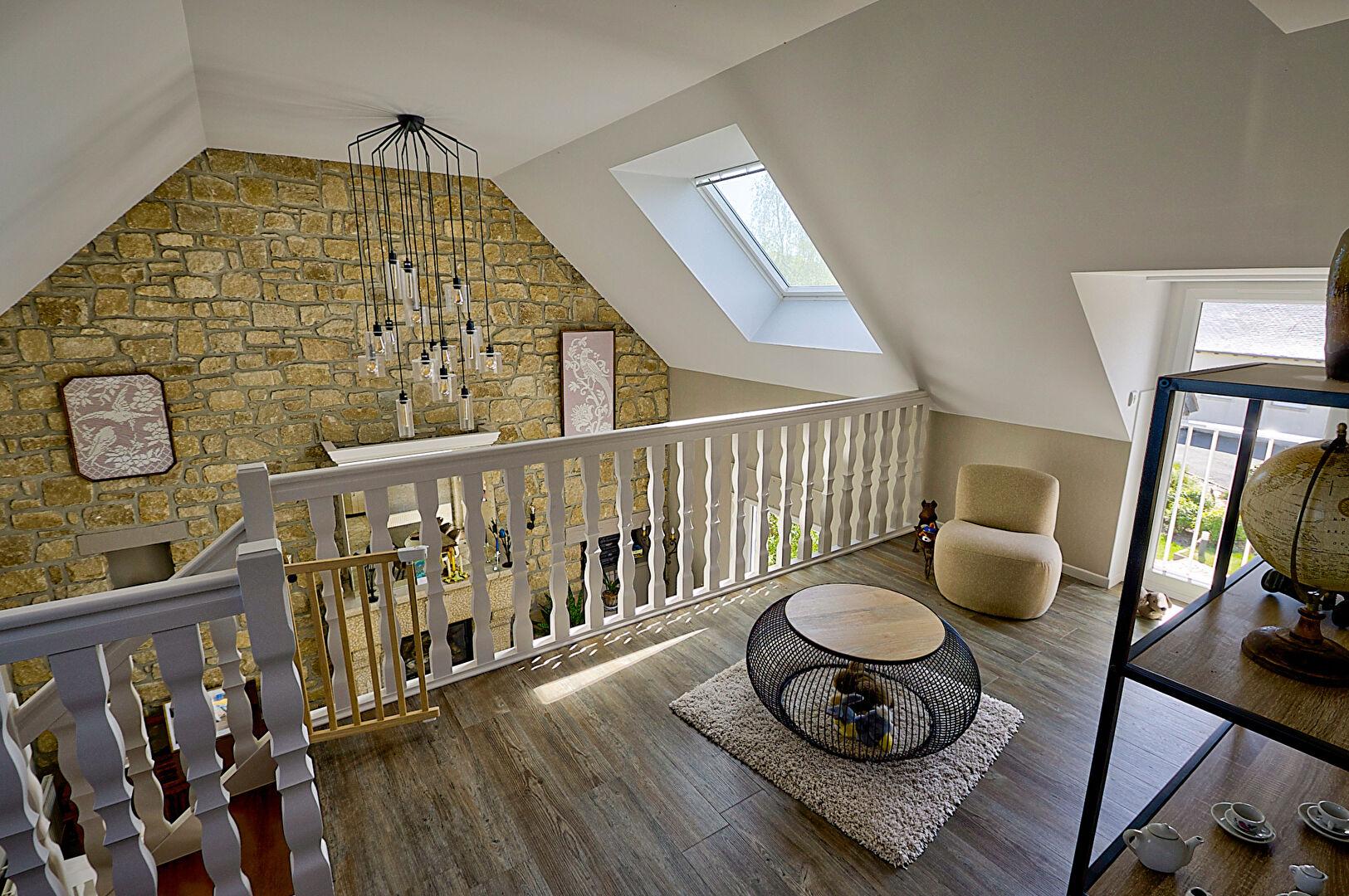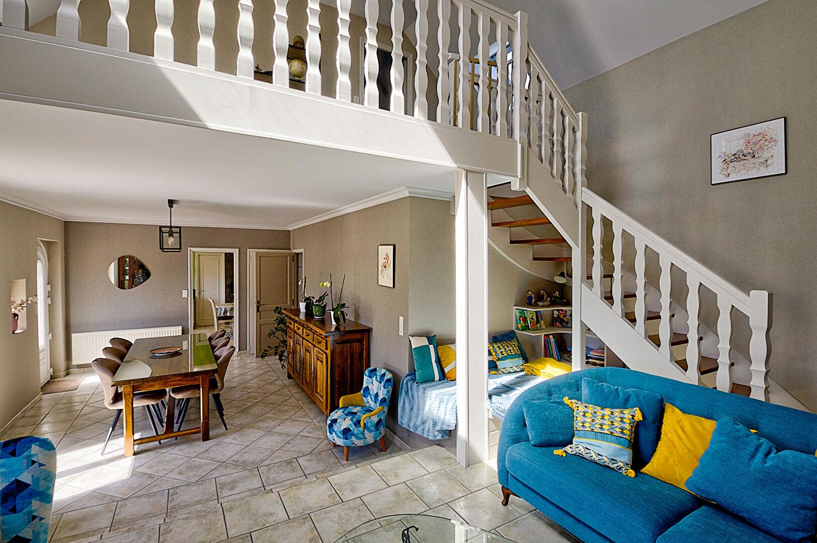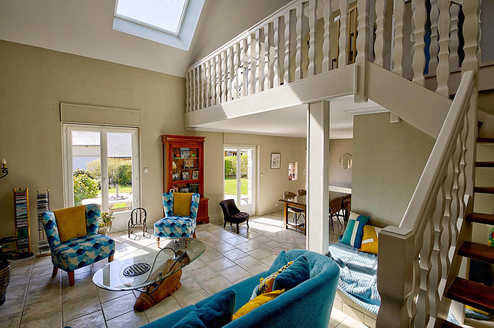 La maison principale de 170 m² séduit par ses volumes et sa luminosité, notamment grâce à un salon-séjour cathédrale ouvert sur une mezzanine.