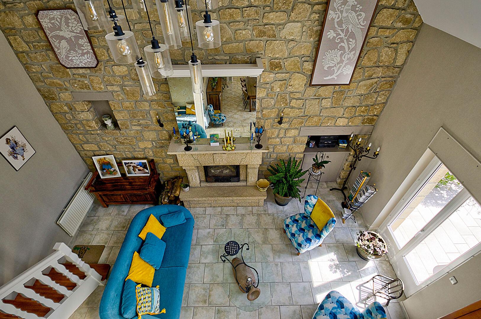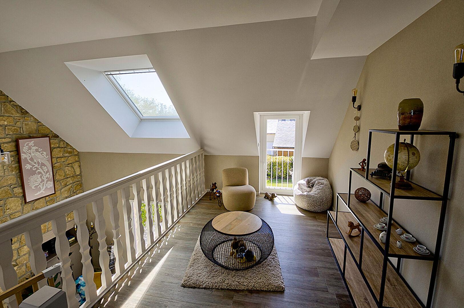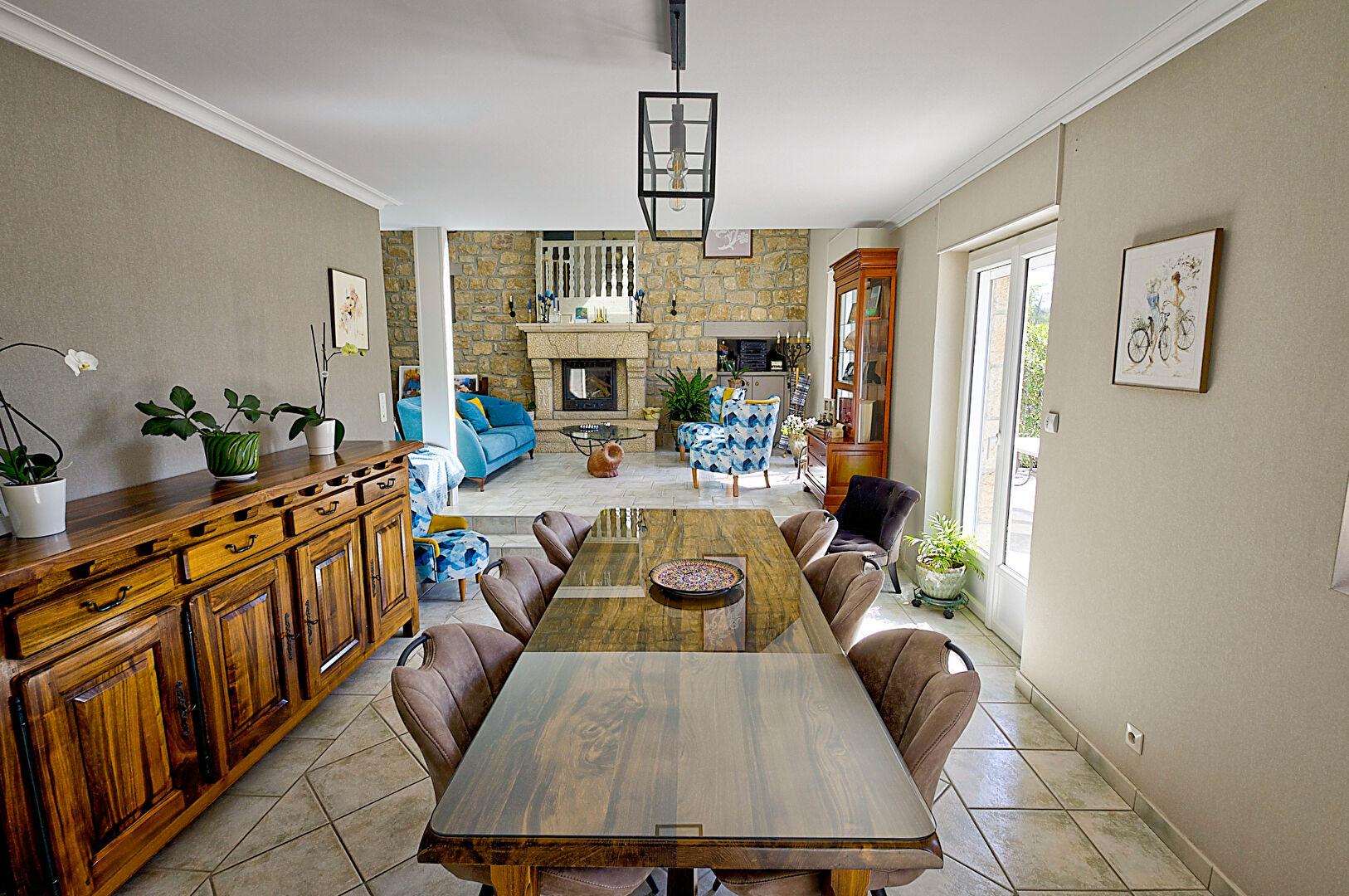 La maison principale de 170 m² séduit par ses volumes et sa luminosité, notamment grâce à un salon-séjour cathédrale ouvert sur une mezzanine.