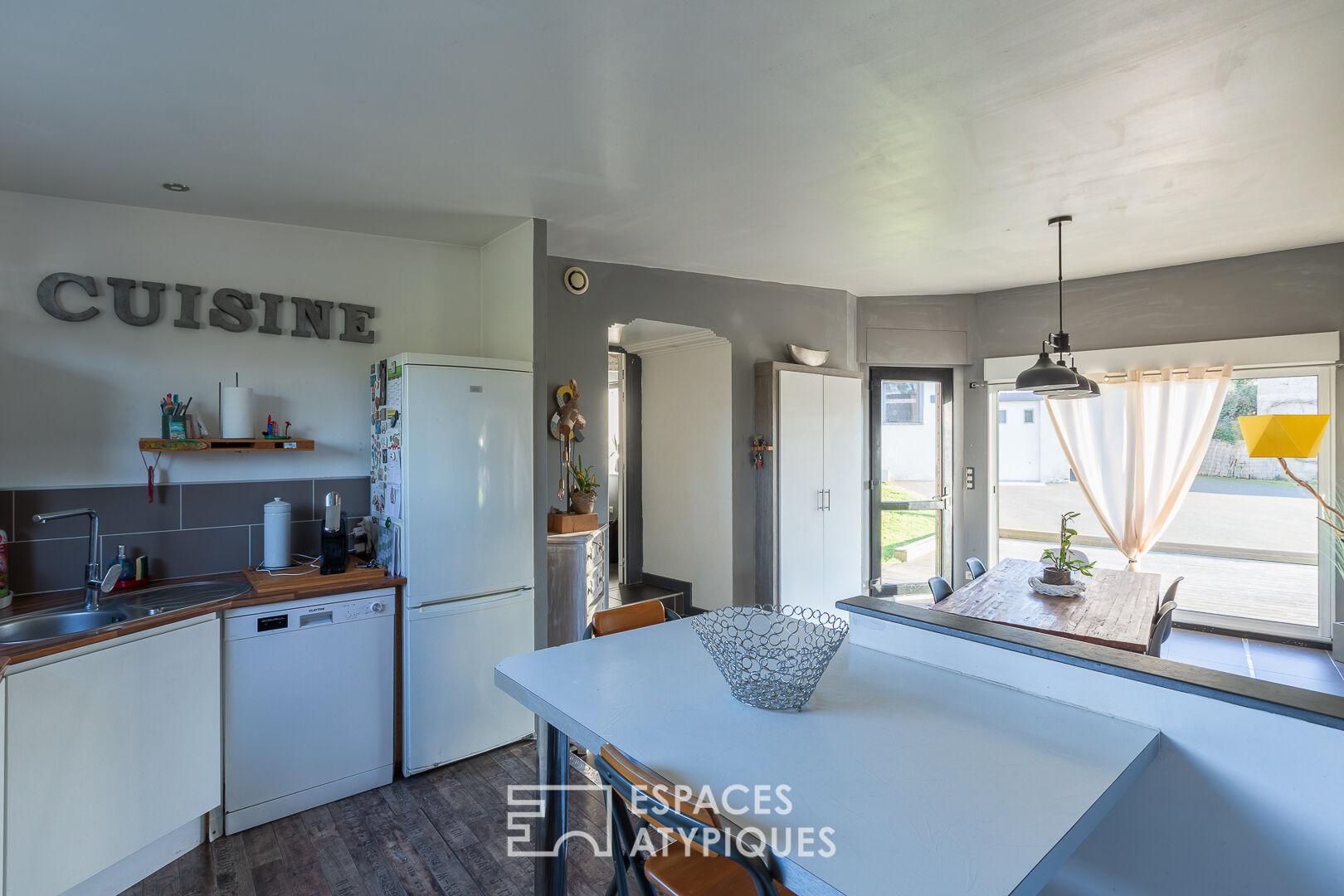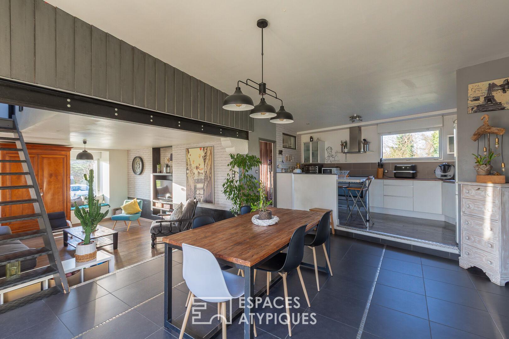 Dès l’entrée, l’espace de vie d’une surface d’environ 50 m² s’ouvre sur le séjour, desservant d’un côté, le salon avec son petit coin lecture vue sur le jardin, et de l’autre, la cuisine aménagée et équipée ouverte sur l’espace séjour et la baie, donnant accès direct sur la terrasse en bois.