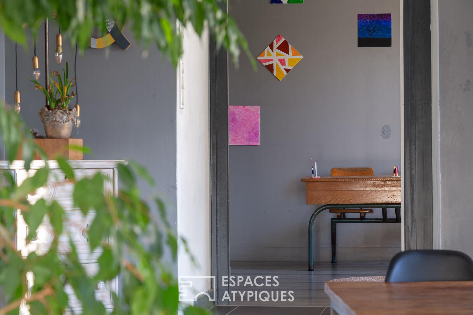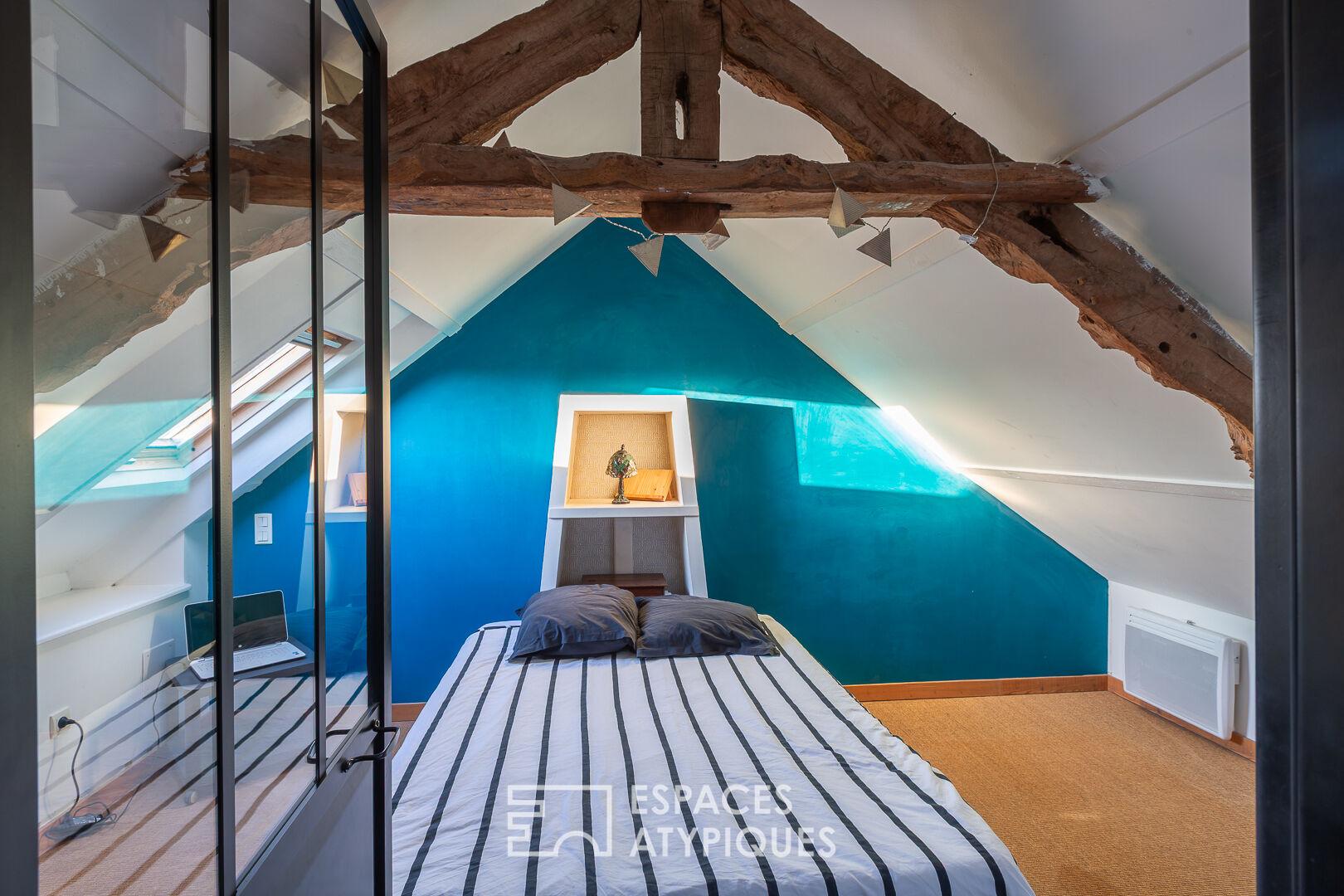 La chambre parentale mansardée dotée de verrières et ses poutres apparentes a trouvé sa place au dessus du salon.