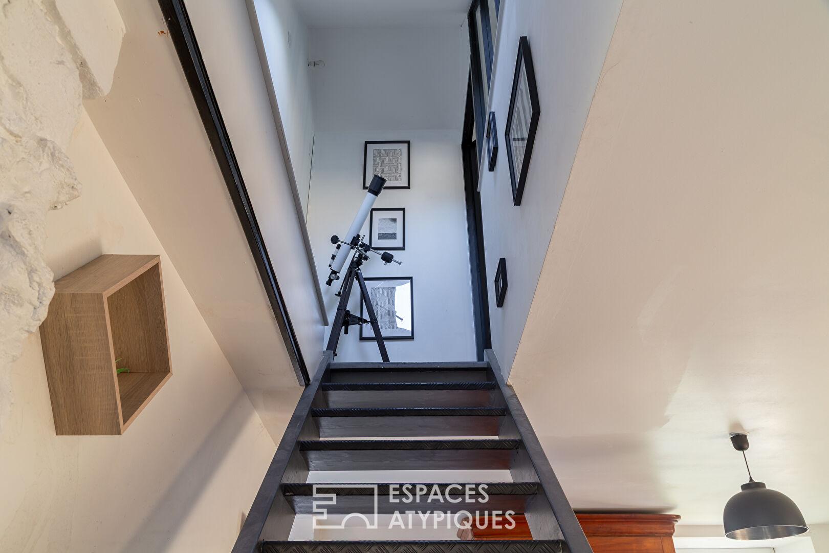 L’escalier en colimaçon nous amène à l’étage qui révèle deux chambres, ainsi qu’une salle de bain, et un WC indépendant.