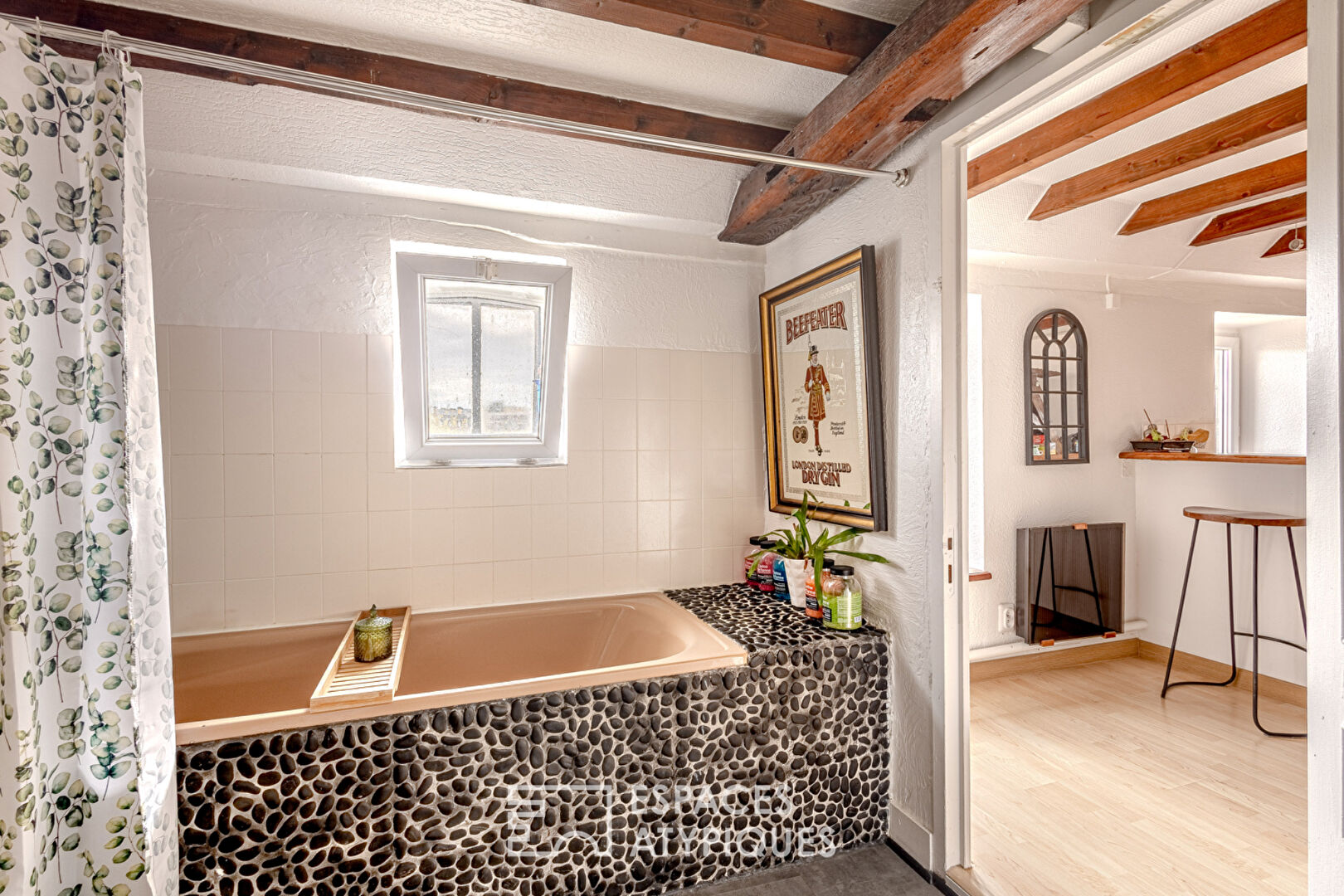 Joliment décoré au goût du jour, l’ensemble dispose d’une salle de bains avec baignoire et sanitaire, ainsi que de multiples rangements et possibilités d’agencement.