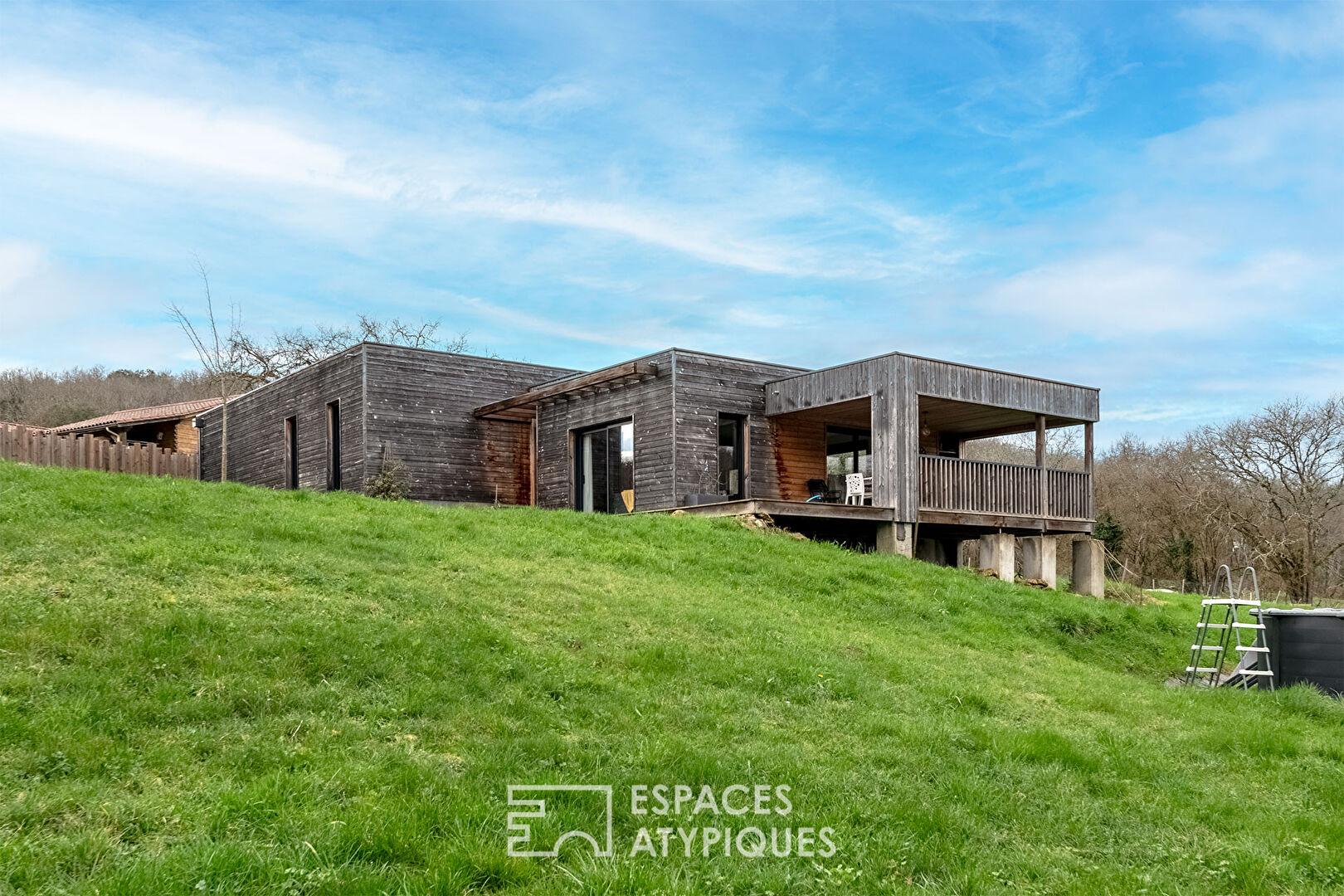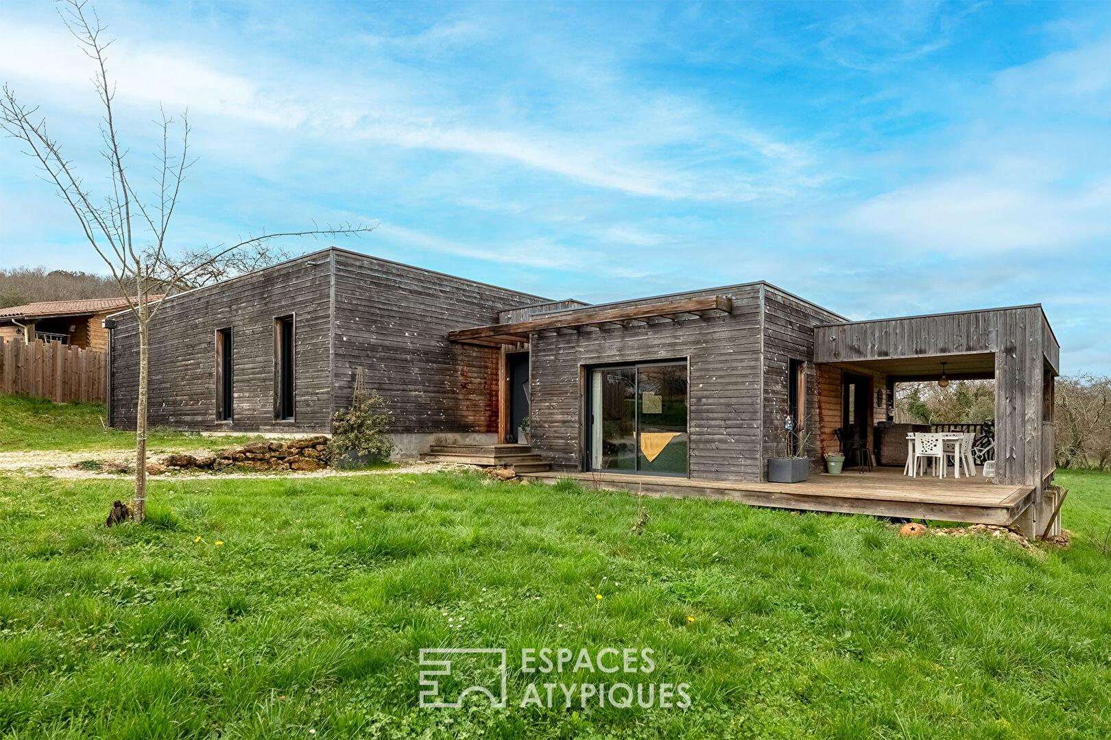 Sa structure en « boîtes » décalées ne se contente pas de créer du relief : elle délimite naturellement des espaces de vie intimistes tout en intégrant judicieusement la chaleur du bois au décor environnant.