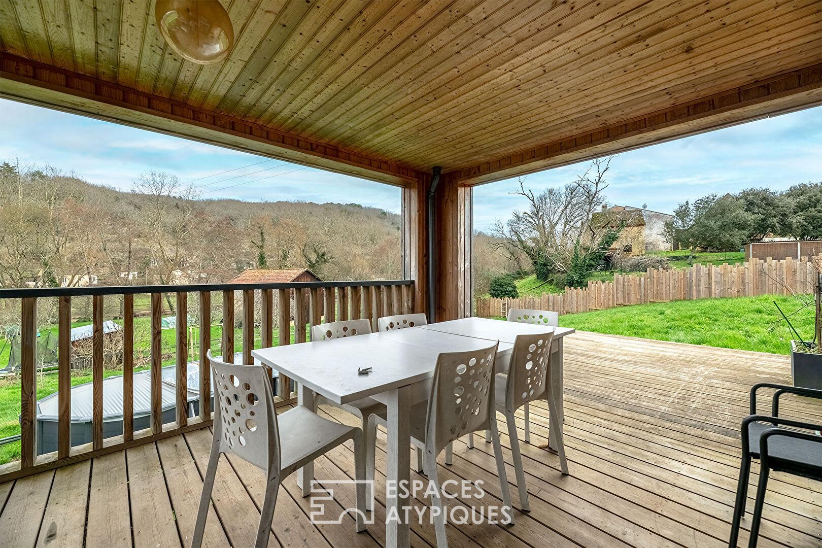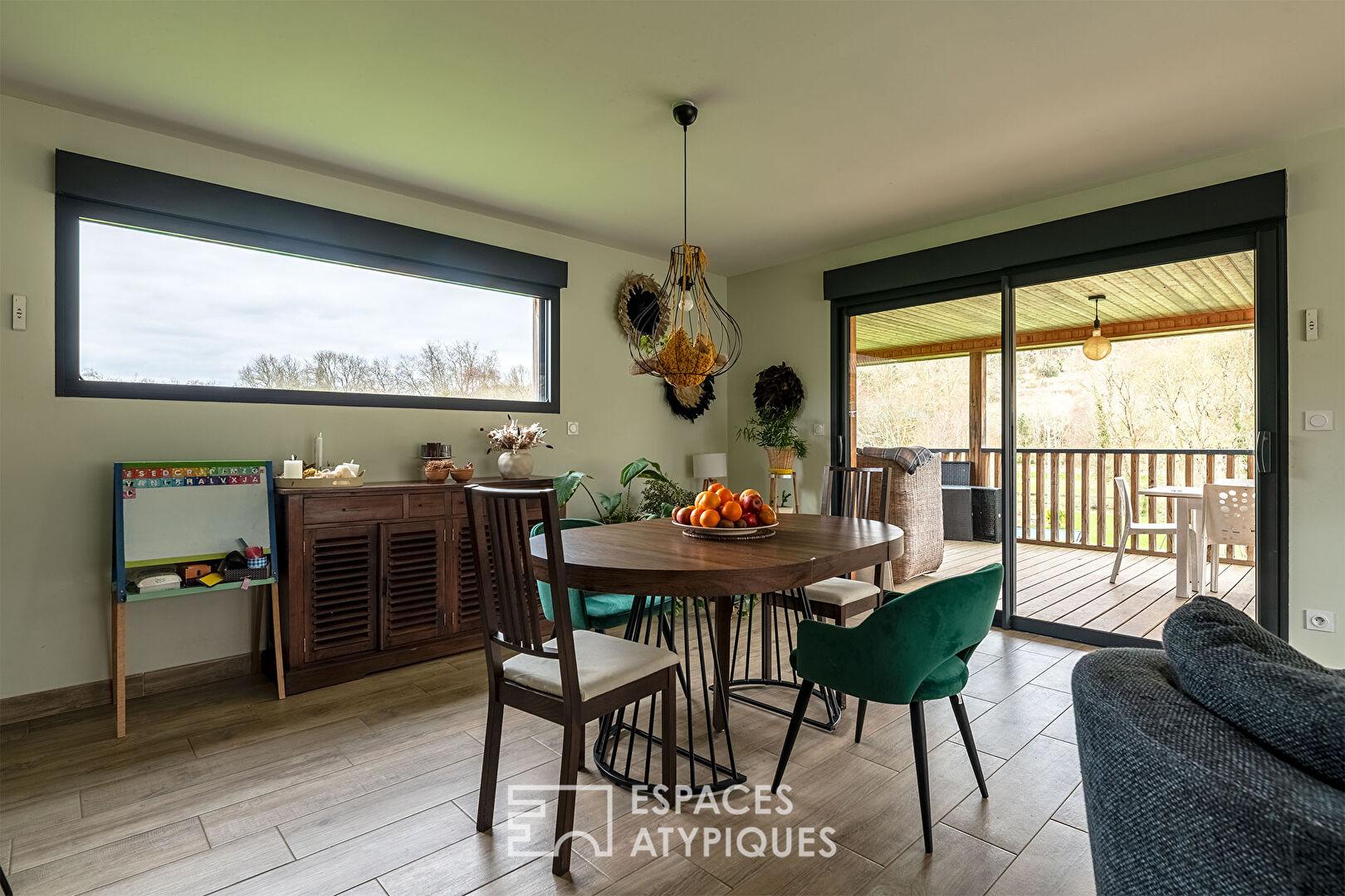 À l’intérieur, la pièce de vie , vaste et chaleureuse , est baignée d’une lumière naturelle grâce à ses larges ouvertures. Véritable prolongement du salon, une terrasse en bois abritée vous invite à un total dépaysement avec pour seul horizon, une vue dégagée sur la nature !