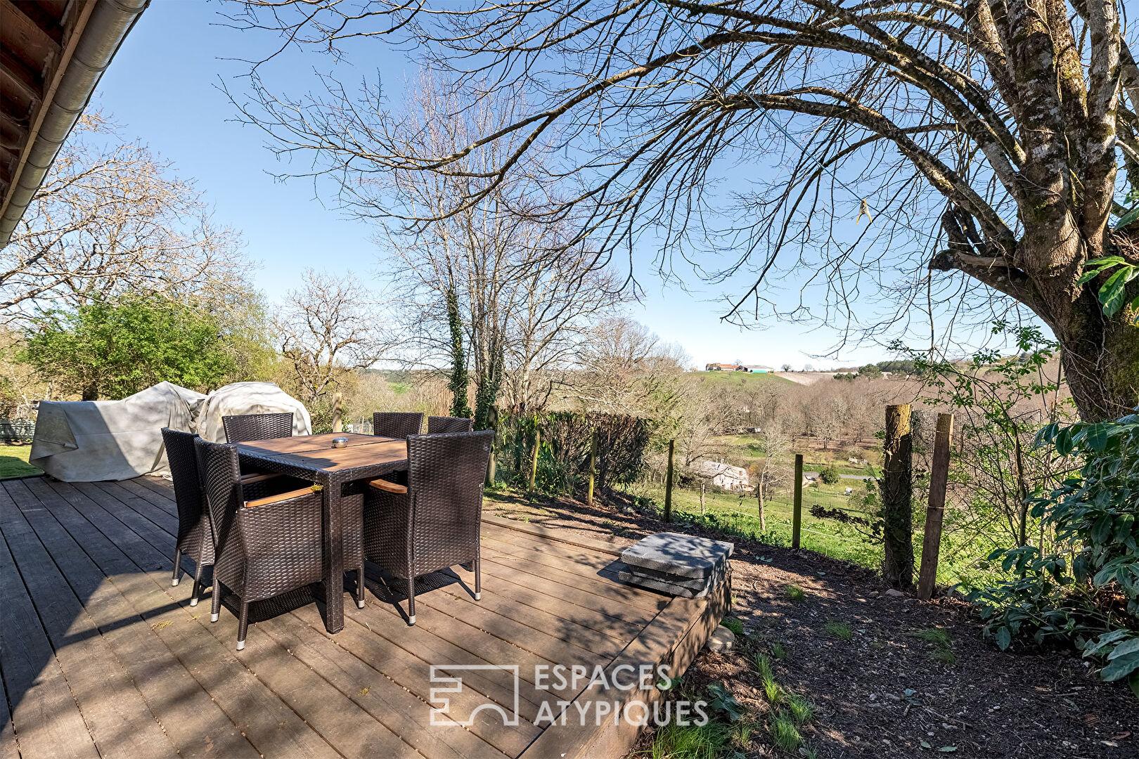 La terrasse en bois prolonge les espaces de vie vers le jardin et offre un cadre de vie idéal pour profiter des saisons et du paysage environnant .