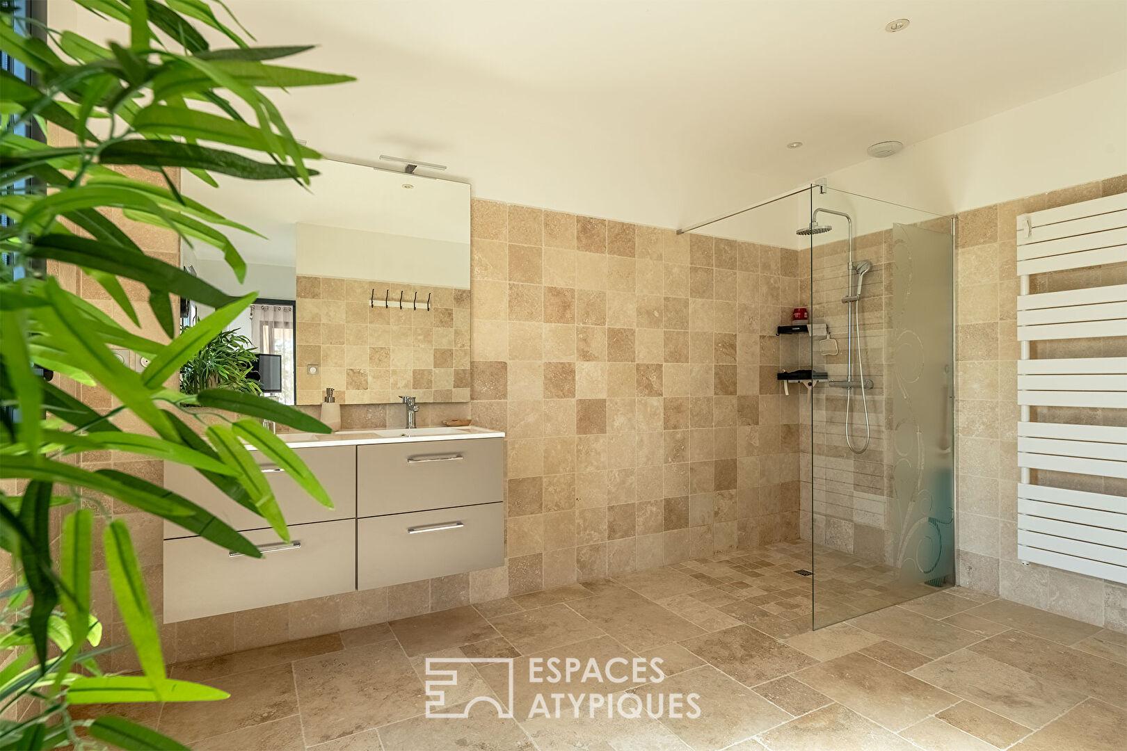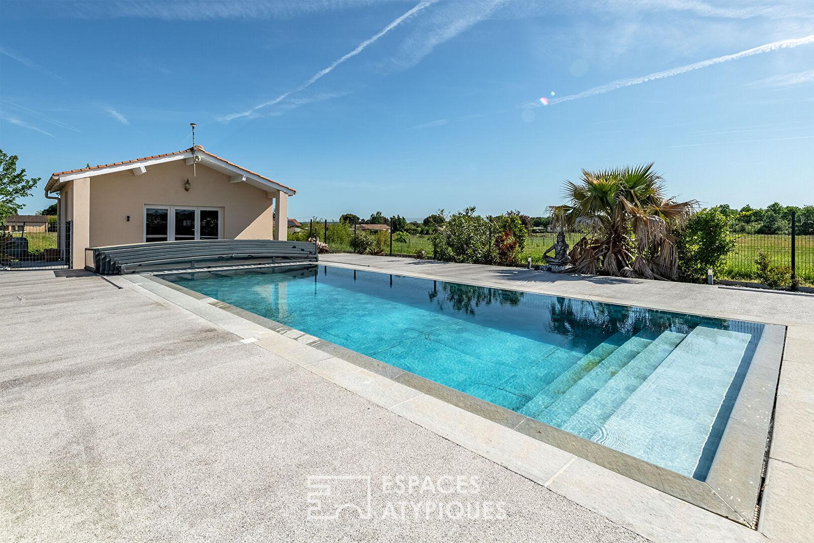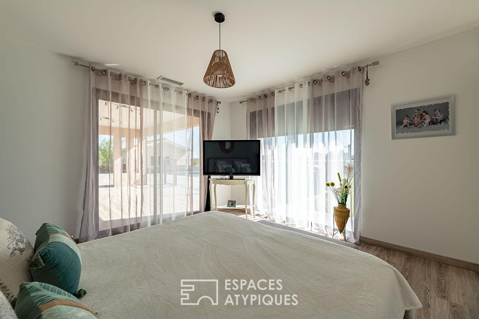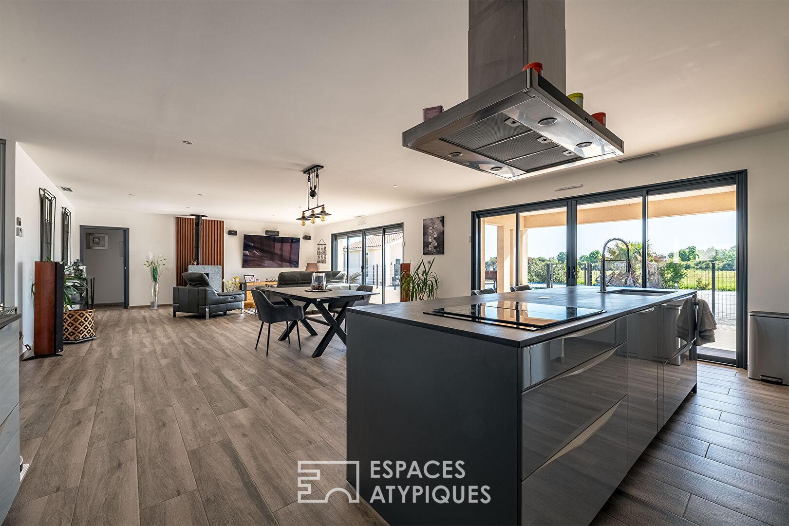 Et lorsque les beaux jours arrivent, grâce aux larges baies vitrées à galandage, le salon et la terrasse ne font plus qu’un, créant une continuité spectaculaire vers la piscine à débordement.