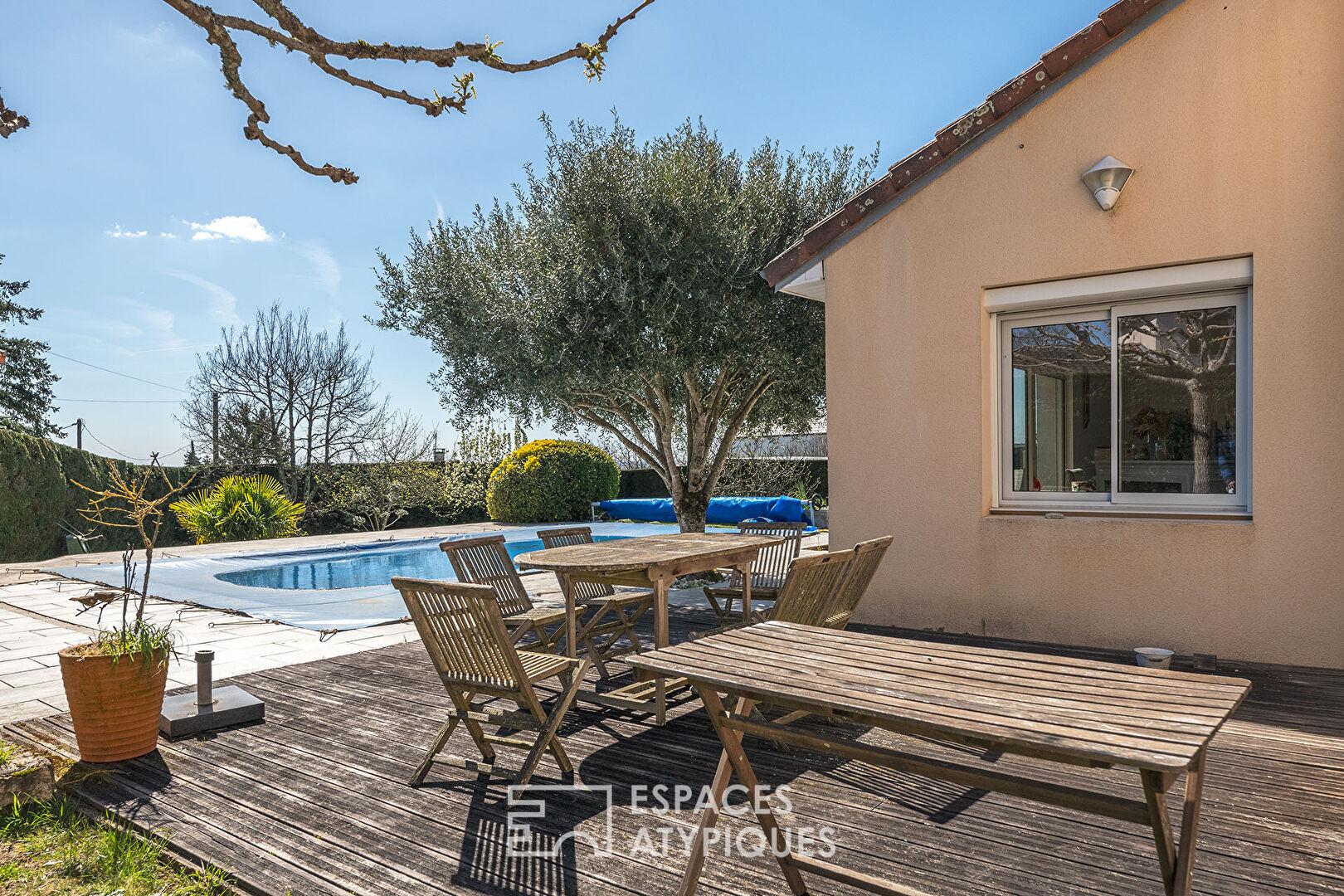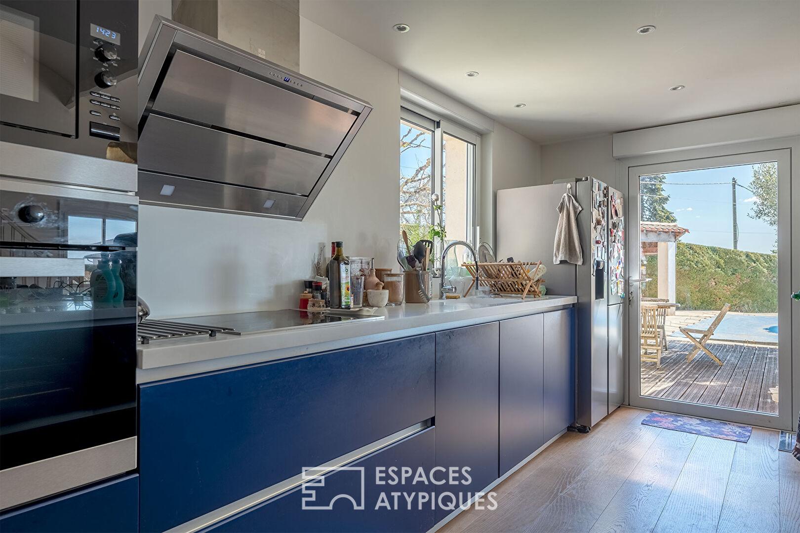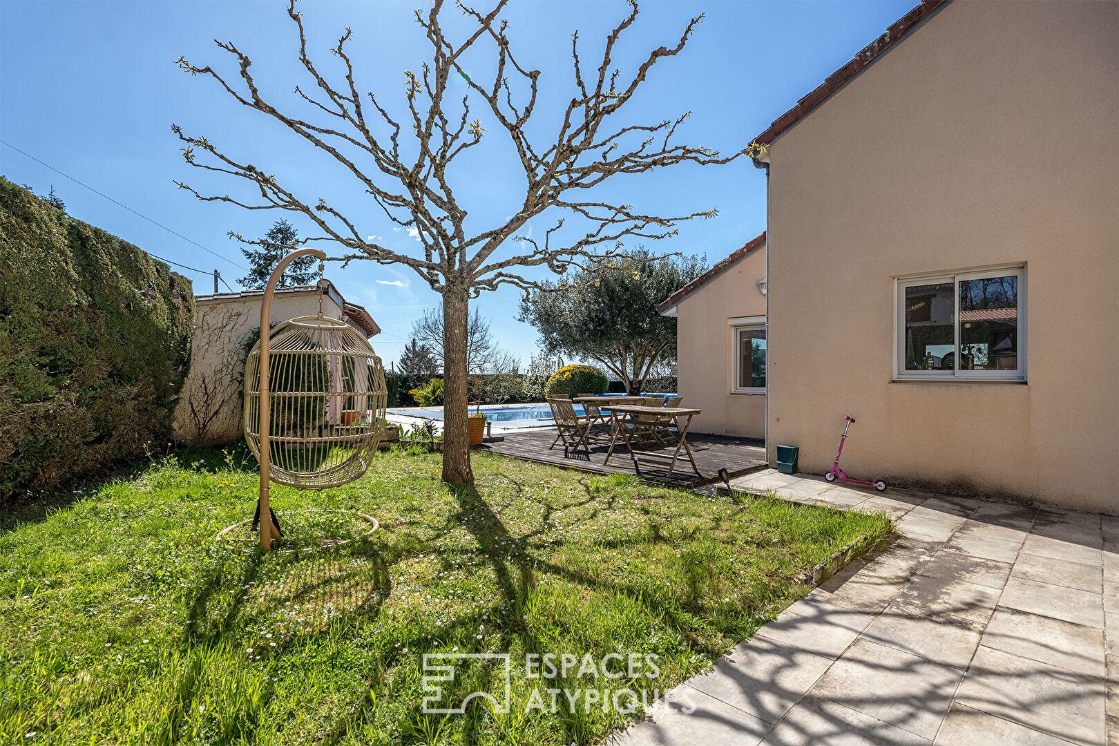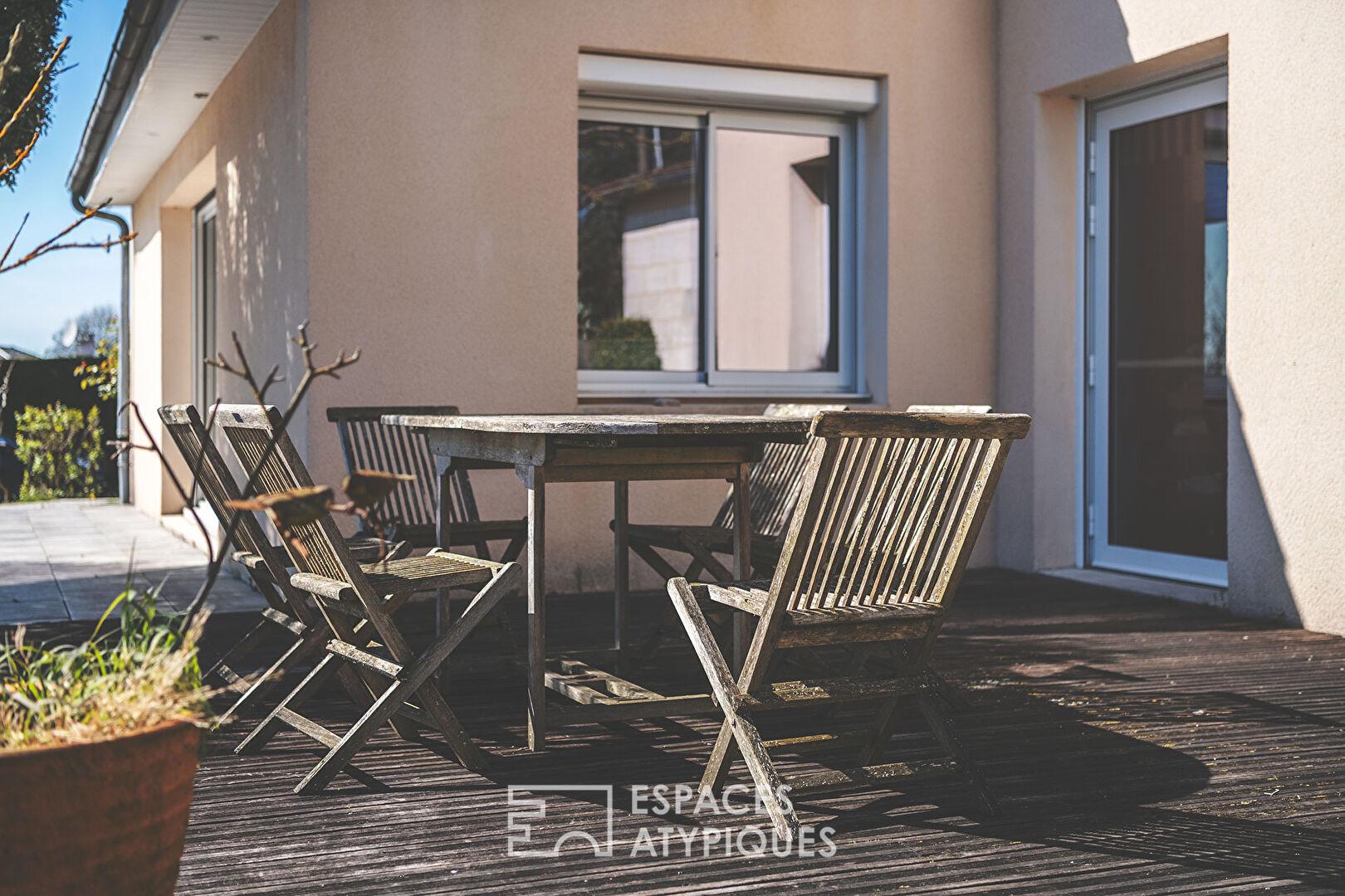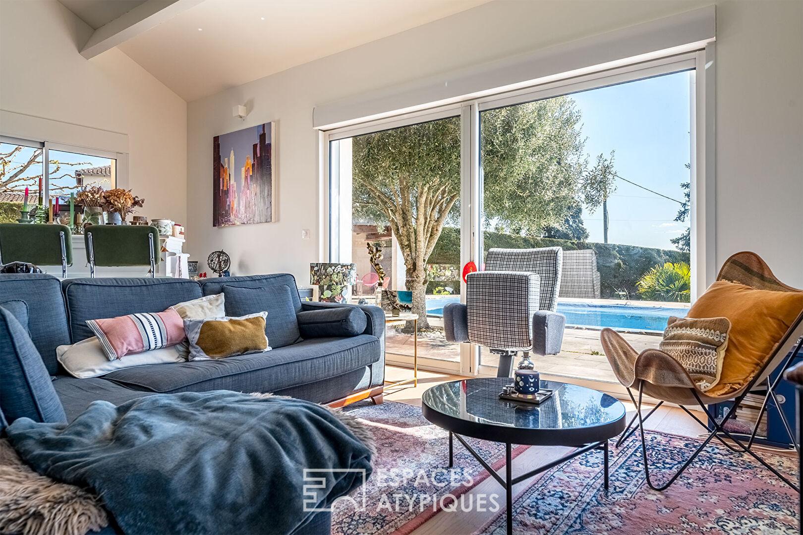 La pièce de vie comprenant le séjour et la cuisine américaine est d’une taille proportionnelle à celle de l’îlot central. L’air y circule, ça respire, la luminosité est sublimée par des baies XXL qui dévoilent un jardin intime sans vis-à-vis, ni trop grand ni trop petit, cosy juste comme il faut, agrémenté d’une piscine 8 * 4 au sel qui attend impatiemment les chaudes journées d’été. La terrasse est coquette et l’effet zen magistral.
