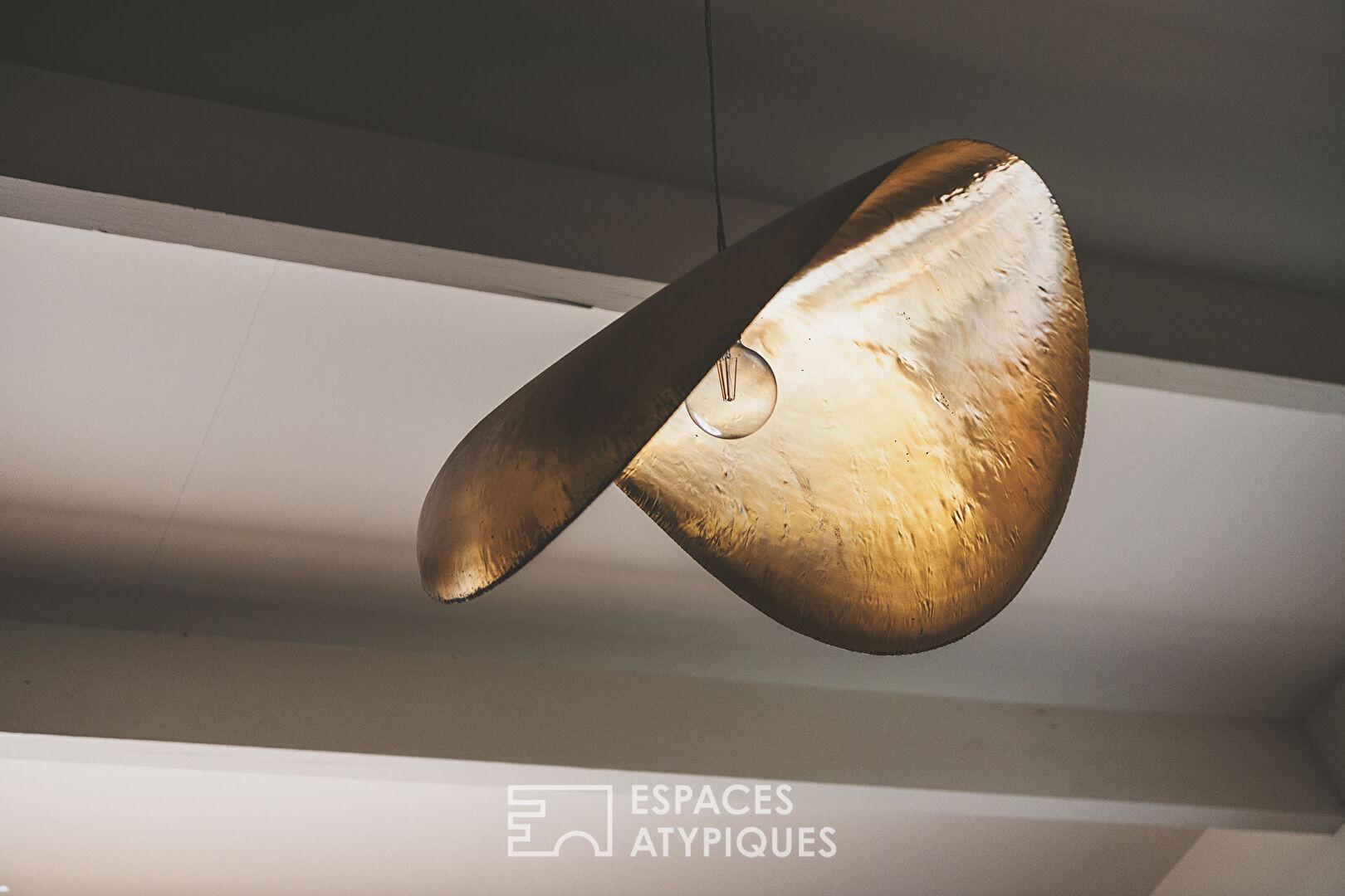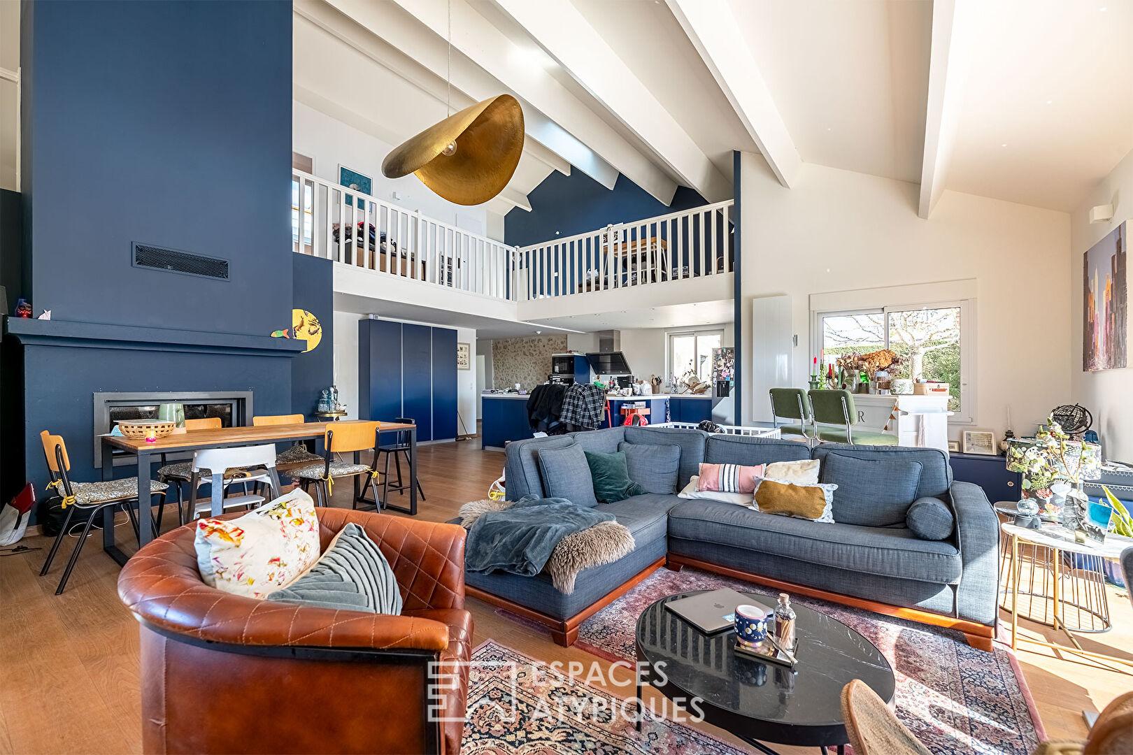 Une fois le seuil franchi, vous découvrez une première pièce faisant office de buanderie, puis une seconde pouvant servir de bureau ou de chambre, à vous d’en définir l’usage. Et là, oubliez les plafonds bas et les esprits étriqués ! C’est le grand frisson vertical, le vertige d’une hauteur cathédrale, une charpente majestueuse qui tutoie les sommets et laisse filer le regard sans entrave dans ce volume d’une fluidité désarmante.