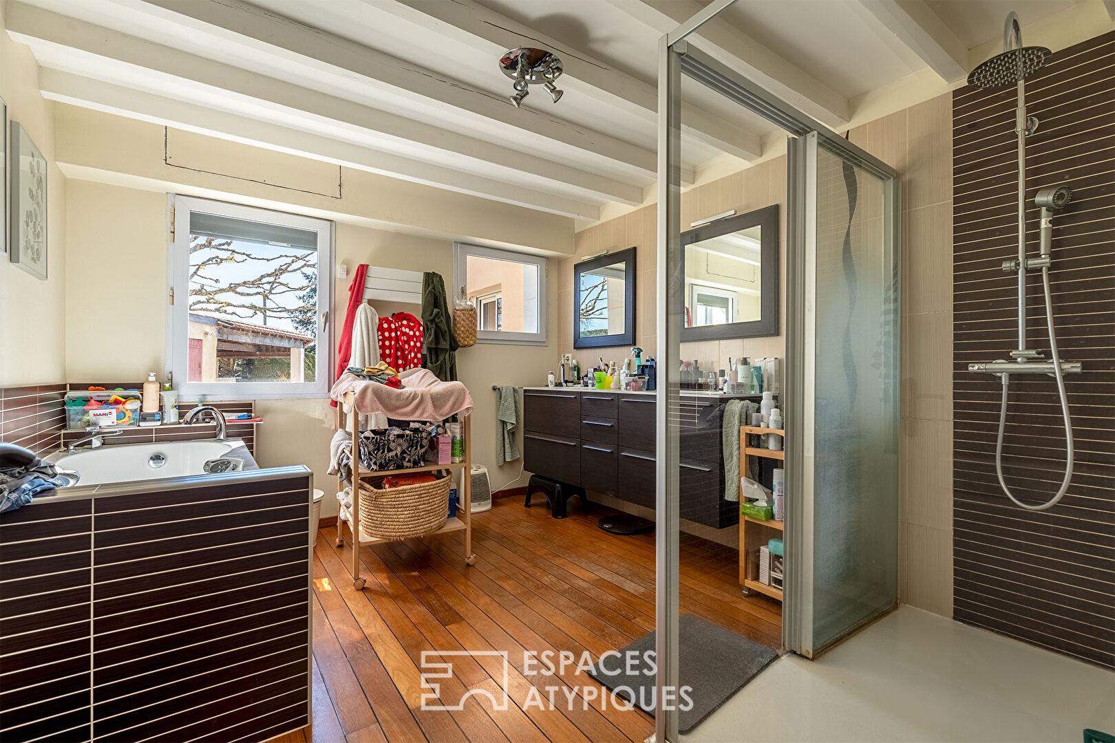 Deux chambres dont une avec accès vers l’extérieur et de belle dimension, une vaste salle de bain aux accents de son époque et un sanitaire indépendant complètent le premier plateau.
