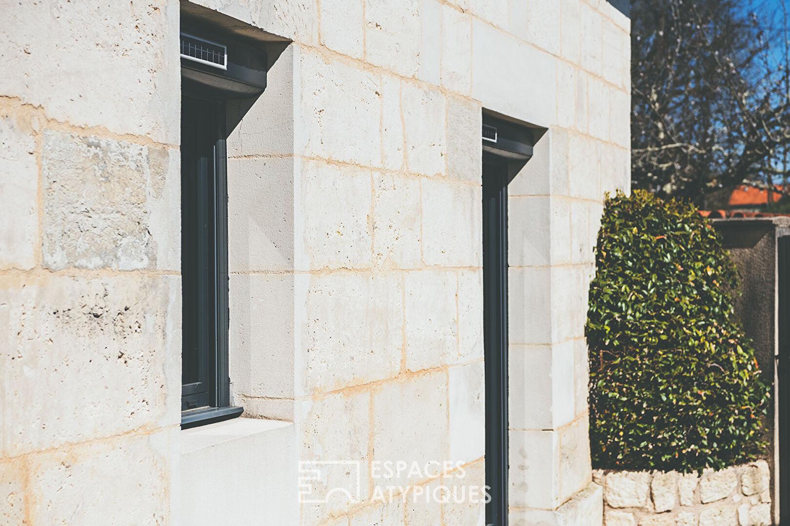 La maison est une conversation complice et d’une clarté suprême entre deux époques. D’un côté l’âme frondeuse de l’ancien, avec ses murs de pierre brute magnifiquement rénovés qui murmurent des histoires à qui veut bien l’entendre. De l’autre, la sagesse de l’extension qui déploie ses ailes de plain-pied pour maximiser le confort et l’ouverture. C’est une symbiose discrète, où la modernité s’allie au temps passé sans jamais courber l’échine face aux conventions.