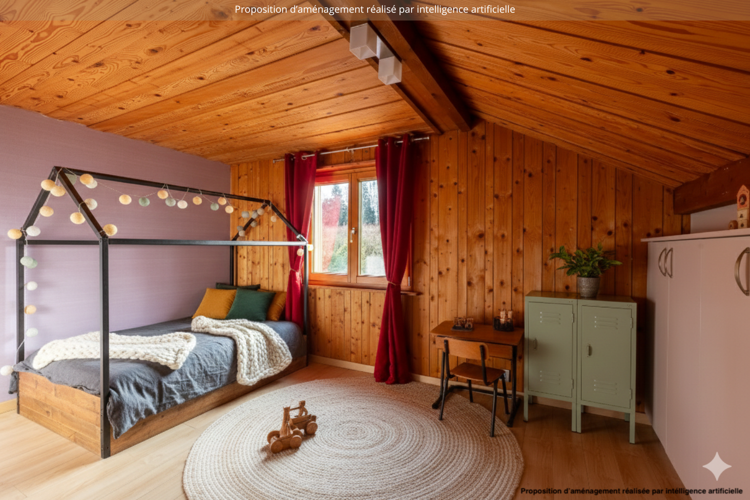 À l’étage, une mezzanine surplombe le salon et accentue le volume du séjour. Trois chambres avec rangements sous pente composent cet étage, complété par une salle d’eau avec WC.