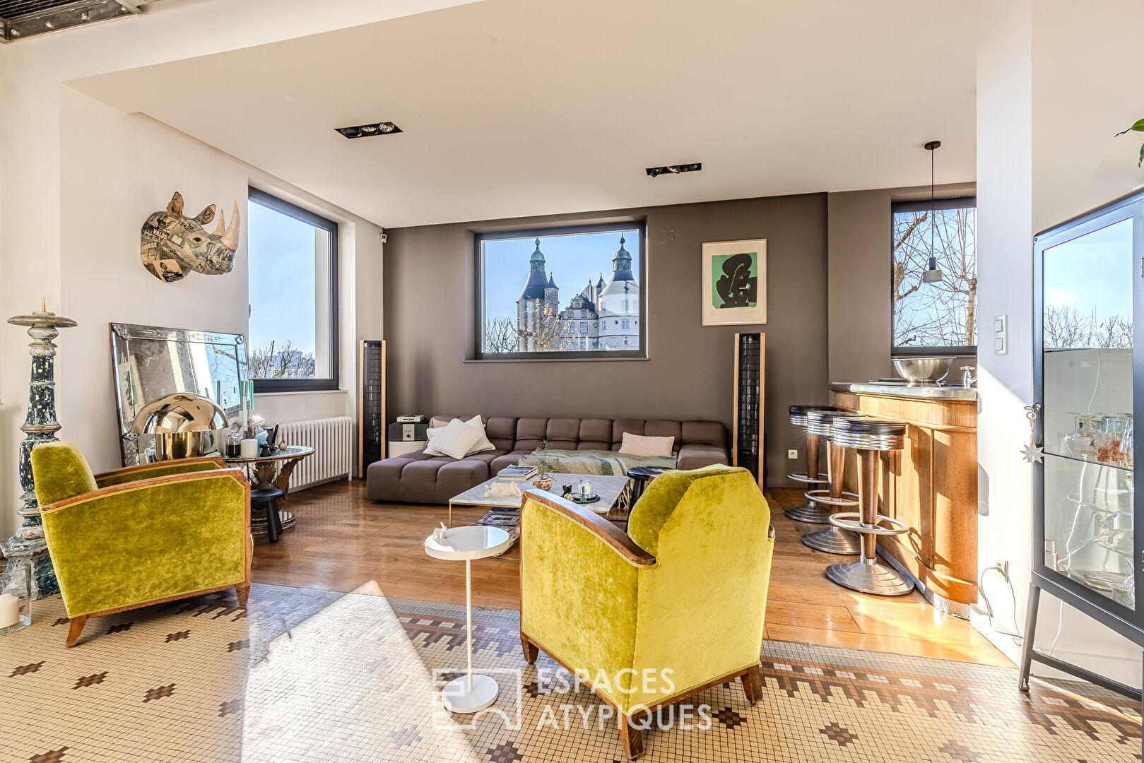 À l’extérieur, la propriété dévoile toute sa singularité. La terrasse, en surplomb, propose un face-à-face saisissant avec le Château de Montbéliard, offrant un panorama rare, probablement l’un des plus spectaculaires de la ville.