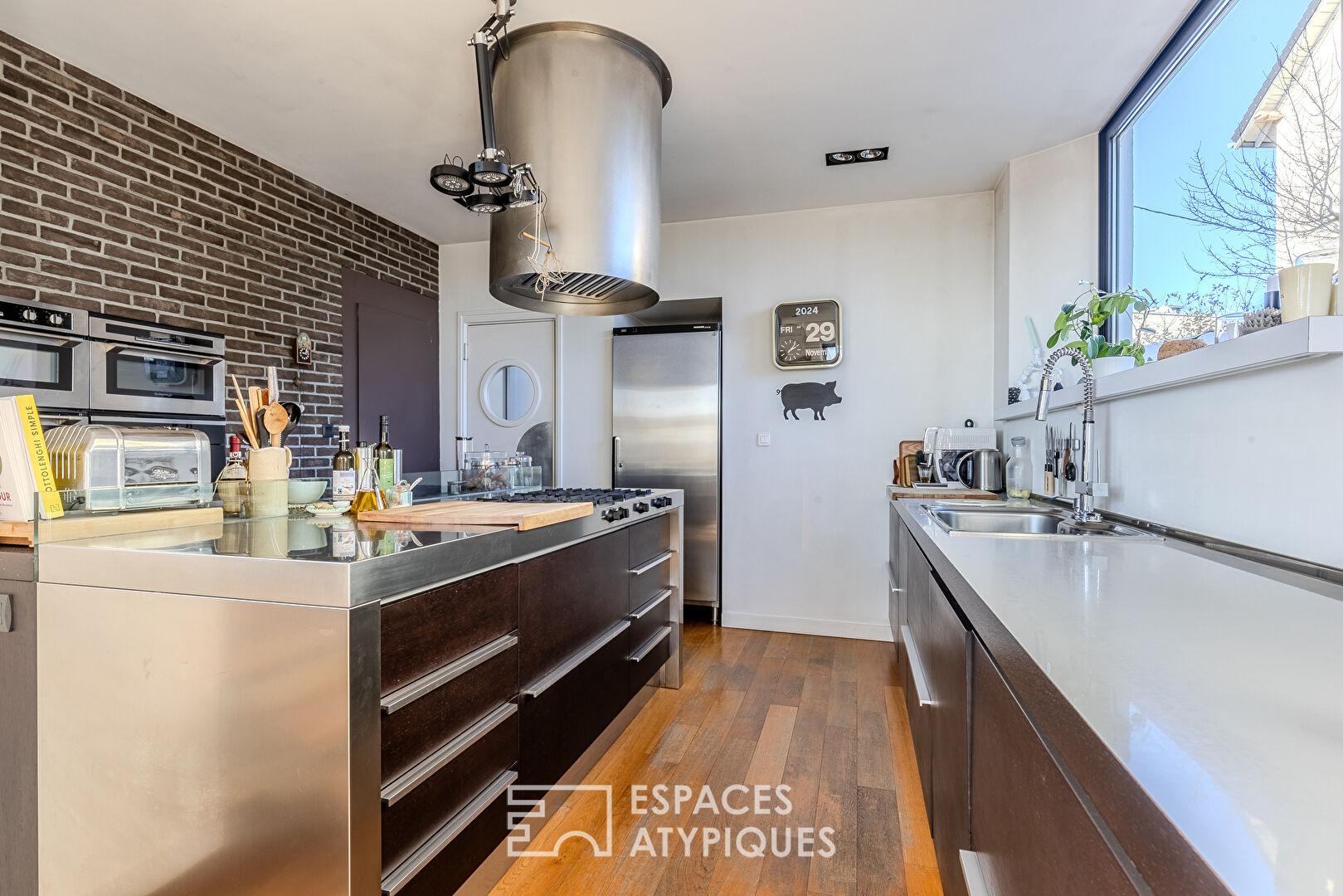 La cuisine ouverte, contemporaine et parfaitement équipée, s’inscrit dans cette continuité fluide, tandis qu’un espace de travail baigné de lumière à l’Ouest complète harmonieusement ce niveau, avec vestiaire et arrière-cuisine.