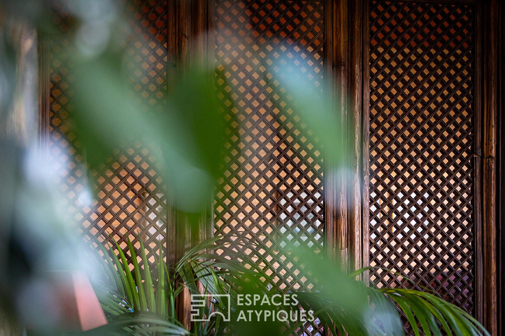 Dès l’entrée, l’architecture intérieure se dévoile avec subtilité. Quelques marches guident vers le salon, baigné de lumière grâce à une baie vitrée et la double hauteur qui dialogue avec la mezzanine. Les volumes prennent toute leur dimension, offrant une atmosphère à la fois aérienne et chaleureuse. Un espace en estrade, aujourd’hui aménagé en coin nuit, évoque un refuge intimiste, idéal pour lire ou se retirer.