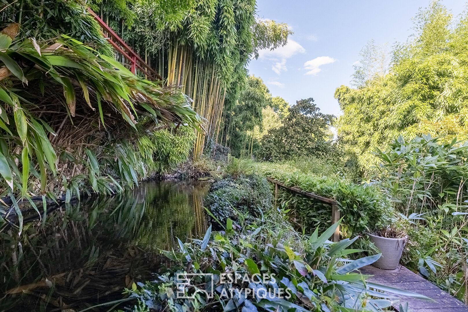 À l’abri des regards, le jardin paysager en paliers compose une succession d’ambiances végétales. La piscine de 12 mètres, pensée comme un couloir de nage, s’intègre naturellement dans cet environnement, invitant à profiter pleinement des beaux jours dans un cadre apaisant.