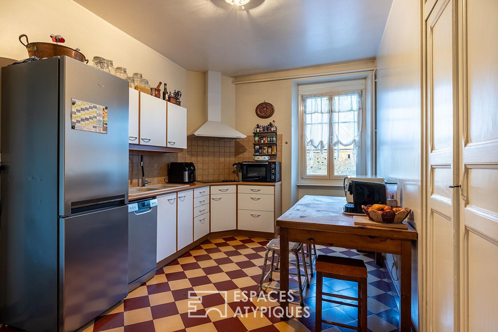 À l’étage, l’espace de vie principal s’articule autour d’une cuisine aux carreaux de ciment d’époque, d’une salle à manger et d’un salon en enfilade sur parquet massif. Une première chambre prend place sur ce niveau, complétée par une salle d’eau avec WC. L’accès extérieur permet une circulation fluide entre l’intérieur et la seconde cour, située de plain-pied sur une autre rue du village.