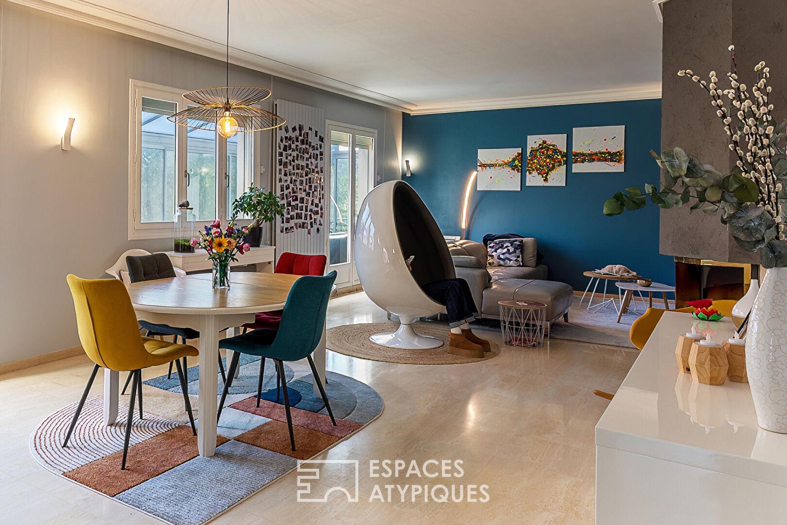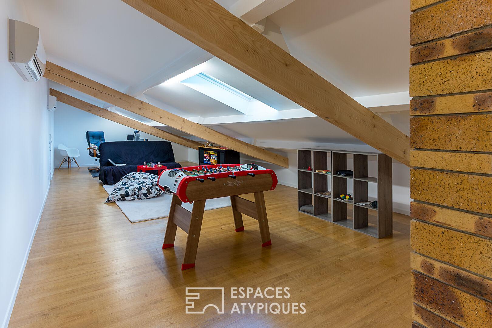 L’espace de réception principal de 41 m2, souligné par un sol en marbre et une cheminée contemporaine, s’ouvre sur une vaste verrière baignée de lumière. L’agencement intérieur privilégie la fluidité avec quatre chambres spacieuses et des combles aménagés aux volumes polyvalents, parfaits pour un atelier d’artiste ou des bureaux confidentiels.