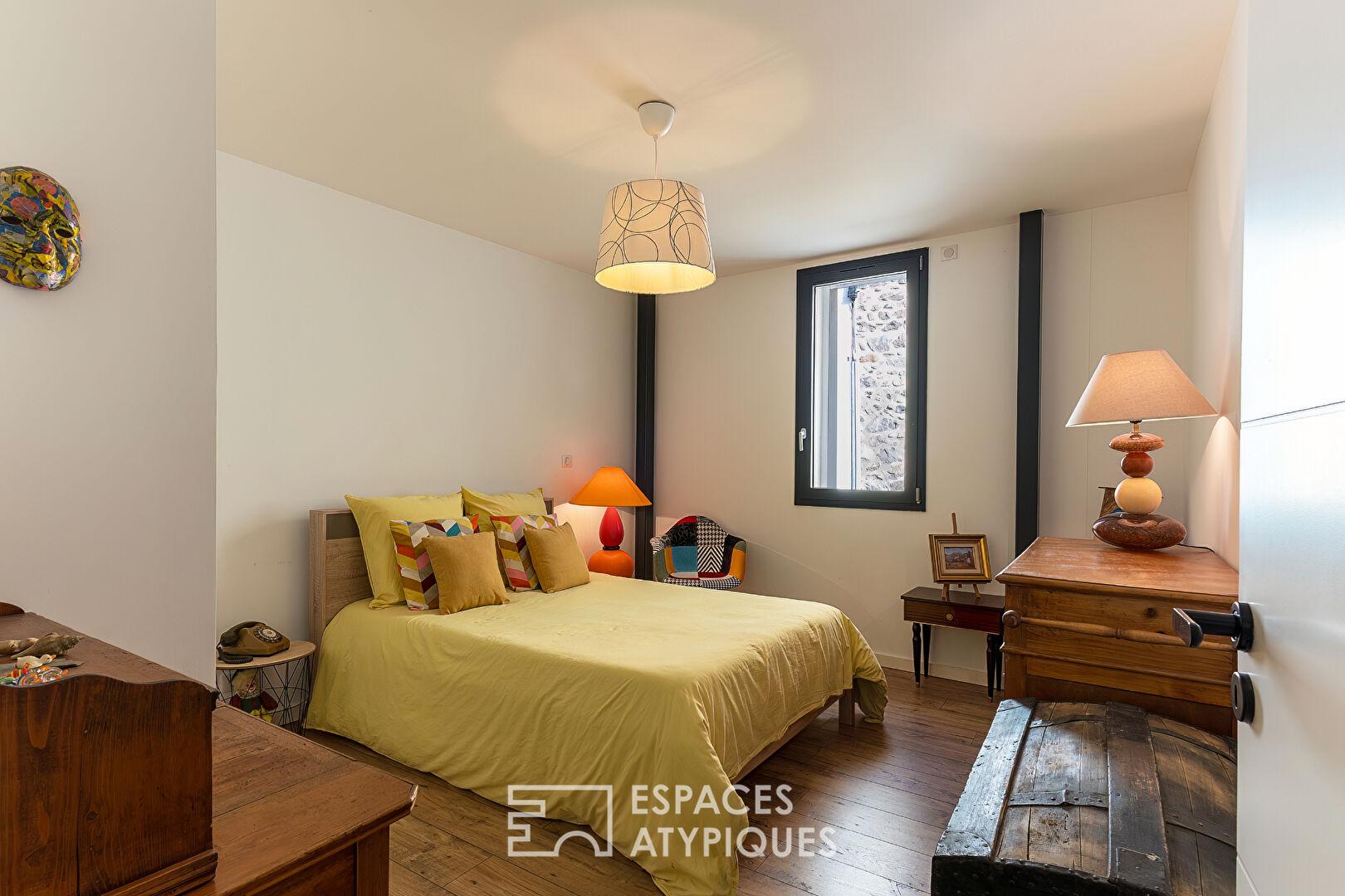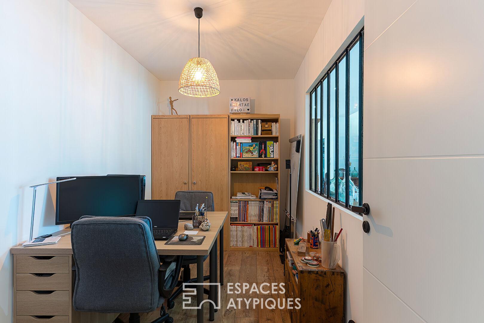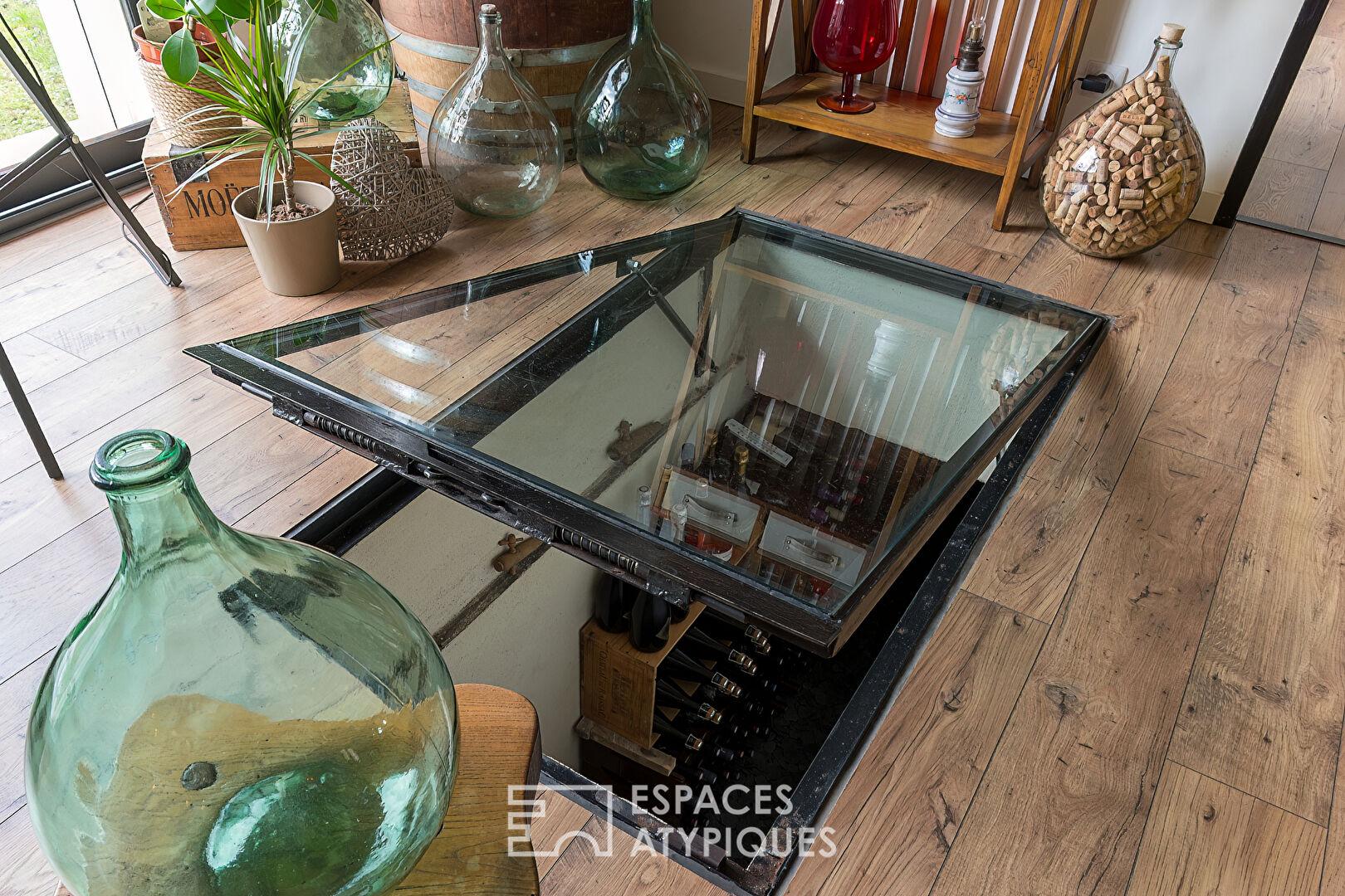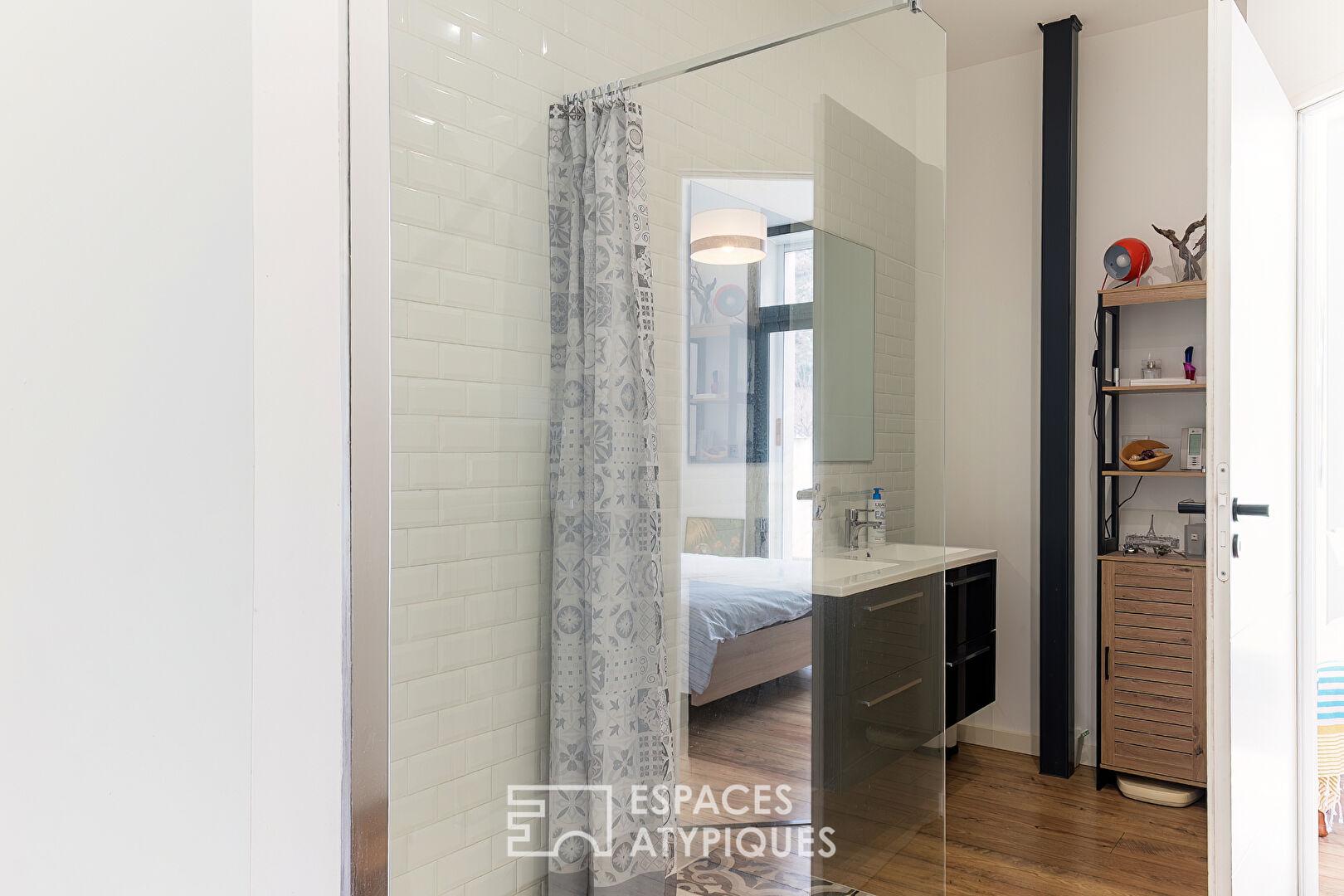 L’immersion débute par une pièce de vie magistrale de 82 m², où la structure métallique de type Eiffel rappelle avec panache le passé ouvrier du lieu. Sous une hauteur sous plafond dépassant les cinq mètres, la lumière sculpte les volumes, jouant entre la minéralité du travertin et la noblesse du parquet. Une verrière intérieure délimite un bureau inspirant, tandis qu’une cave à vin vitrée encastrée dans le sol, promet des moments de convivialité suspendus. Côté nuit, le plain-pied accueille quatre chambres spacieuses dont une suite parentale de 25 m². Le confort technique est ici souverain : un chauffage au sol par pompe à chaleur et une isolation de haute volée garantissent un diagnostic de performance énergétique (DPE) classé AA, un véritable gage de sérénité.