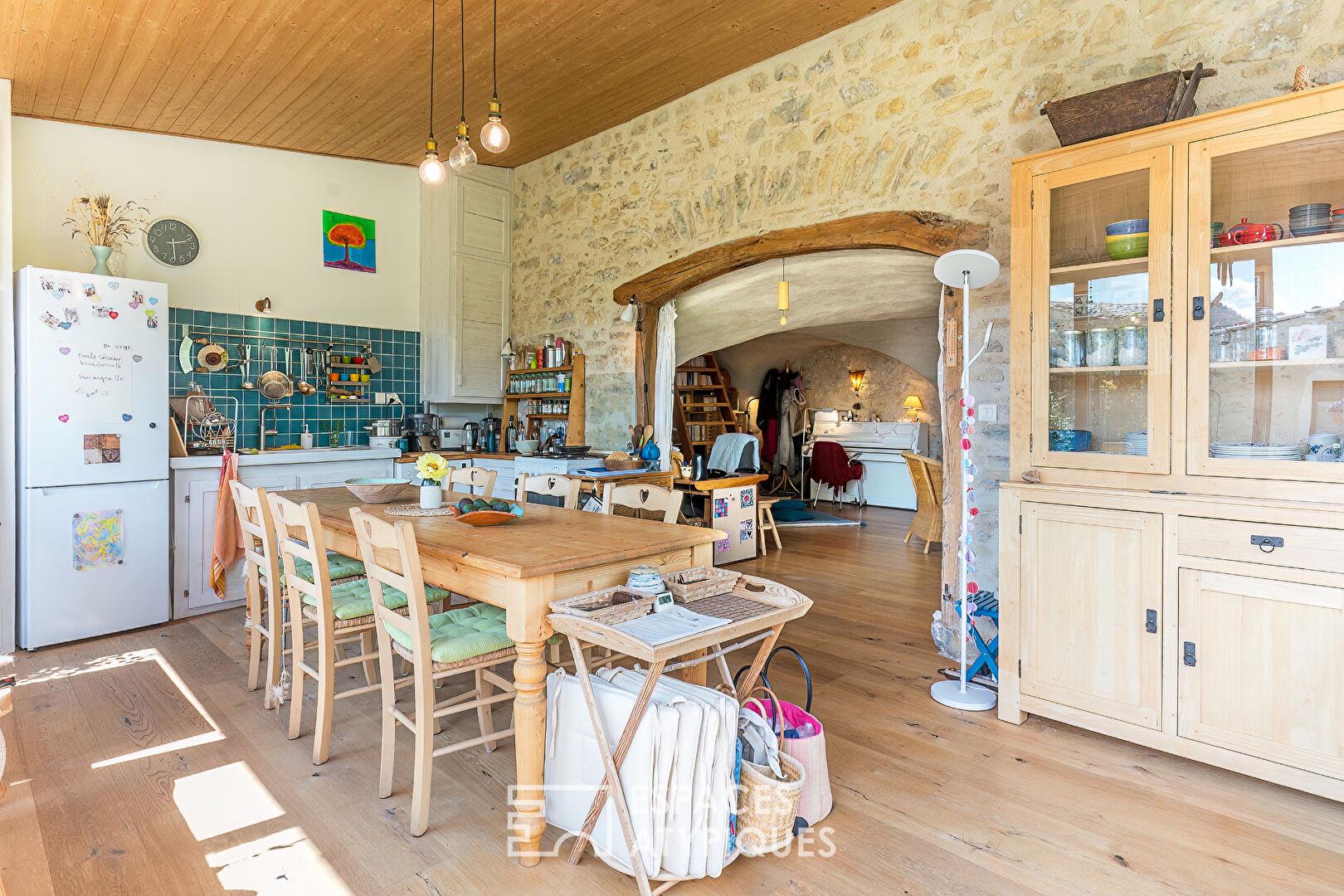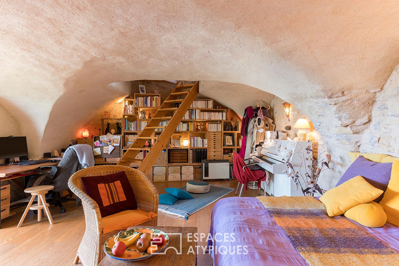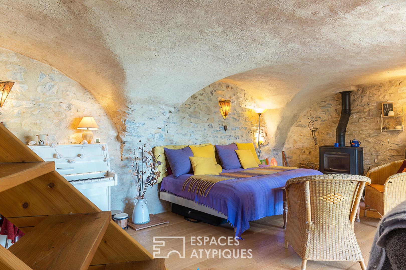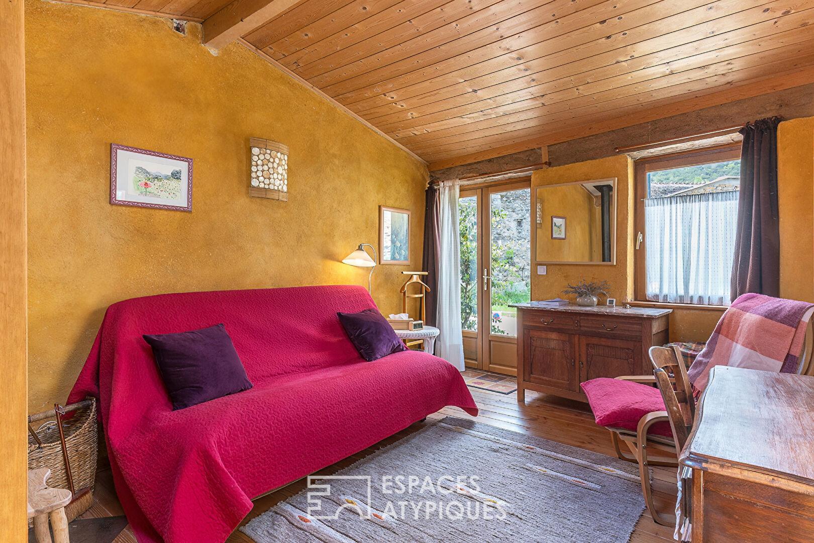 À l’intérieur, la rénovation met l’accent sur la lumière et des volumes de charme. La première maison accueille une pièce de vie en véranda, véritable trait d’union avec la nature, qui mène à un salon chaleureux niché dans une pièce voûtée. Un permis de construire a d’ailleurs été accordé pour l’installation d’une seconde véranda dans le prolongement de ce salon vouté, offrant ainsi une perspective d’agrandissement lumineuse. Cet espace est équipé d’un poêle à bois et d’une pompe à chaleur réversible. L’étage abrite une charmante piece paliere avec accés independant, une chambre profitant d’une belle vue ainsi qu’une petite salle d’eau avec WC.