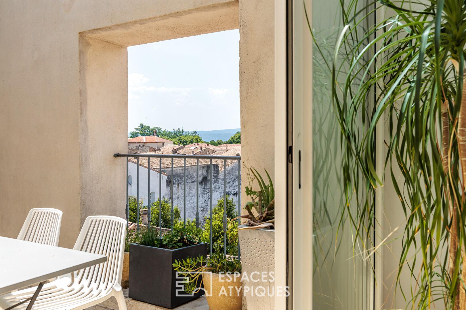 La lumière naturelle crée une atmosphère apaisante et chaleureuse. Le vaste salon avec belle cheminée, prolongé par une élégante salle à manger et une terrasse tropézienne offre une belle vue sur les toits de la ville et les montagnes d’Ardèche.