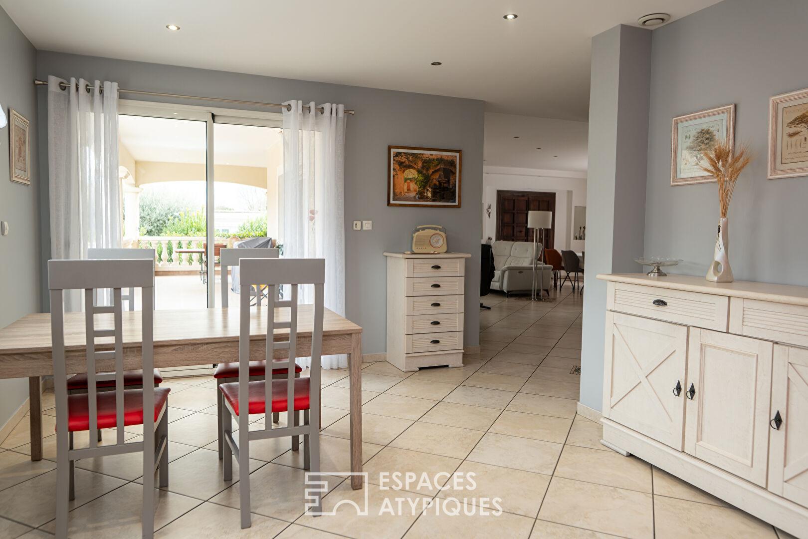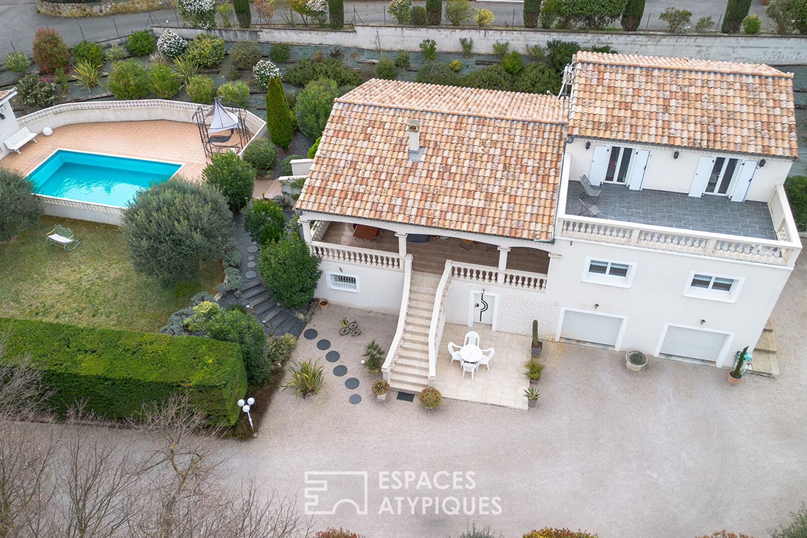 Les extérieurs sont une ode à la convivialité avec 80 m² de terrasses, dont une partie couverte pour les déjeuners à l’ombre. La piscine sécurisée s’insère dans un jardin clos et arboré, véritable cocon à l’abri des regards. Un double garage de 65 m² et un stationnement dédié aux véhicules de loisirs soulignent l’aspect pratique de ce bien d’exception. À moins de 5 minutes, le quotidien est facilité par la proximité immédiate des commerces et des écoles de la Drôme.
