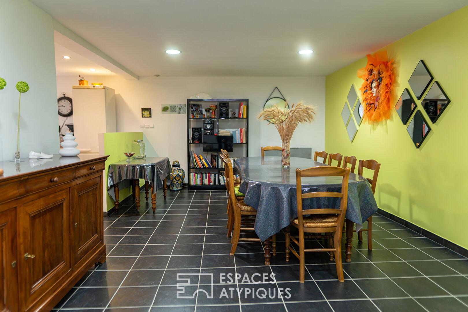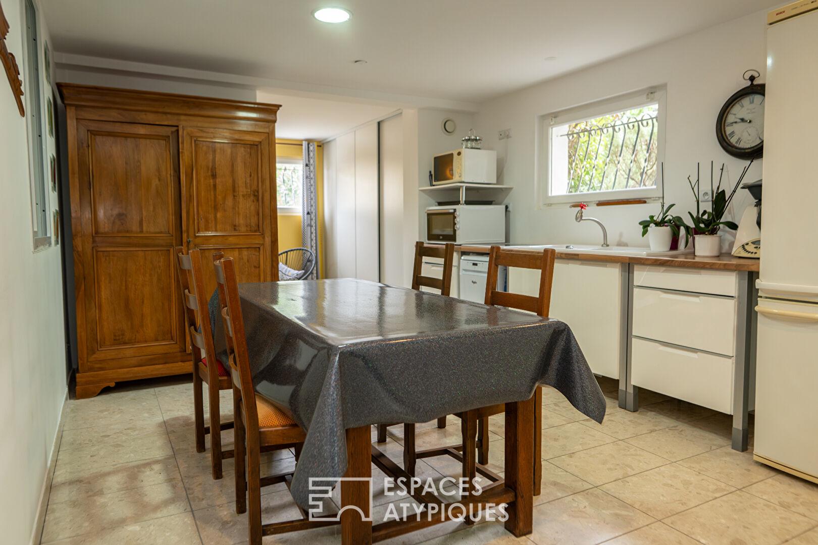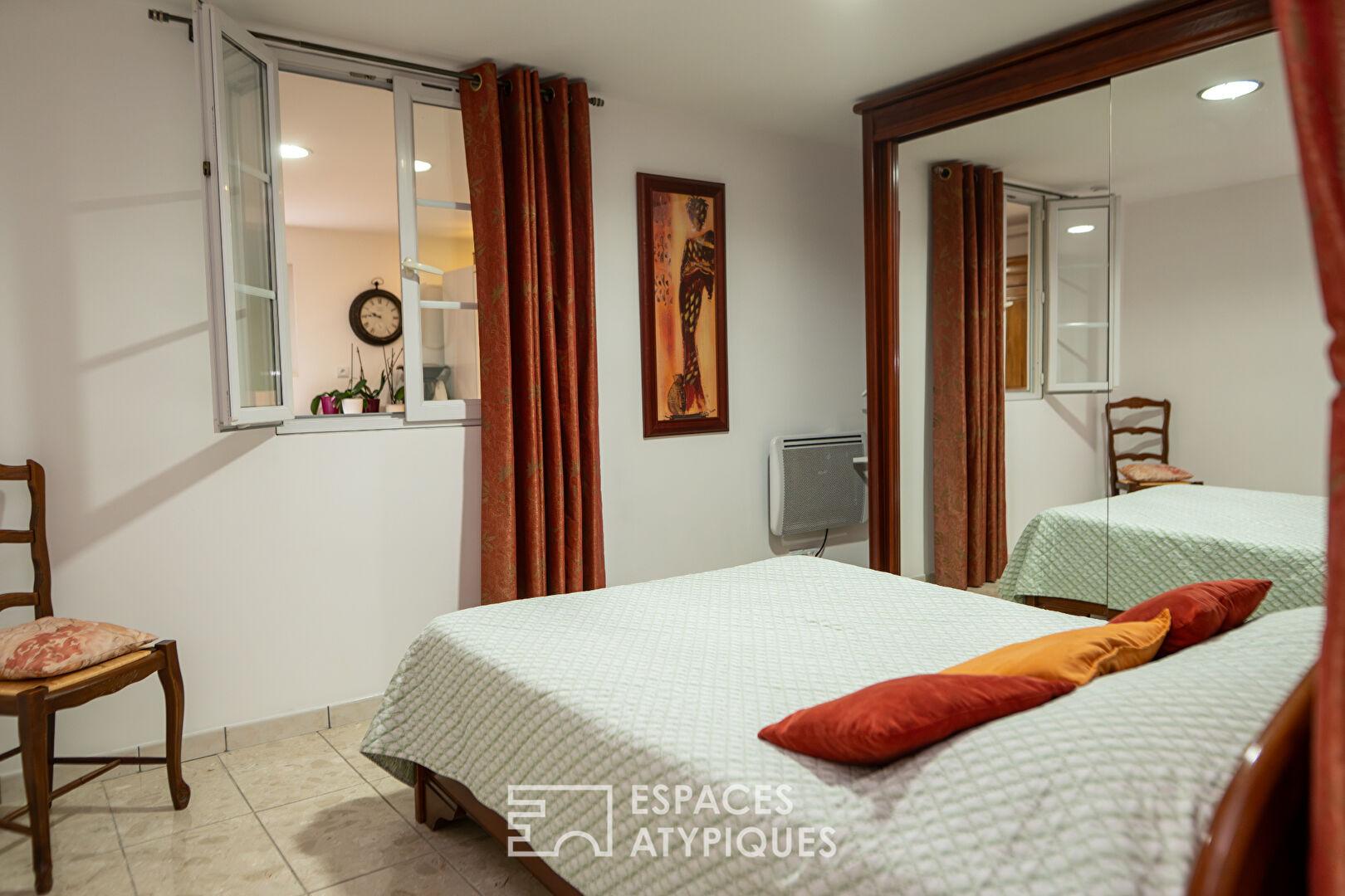 En rez de chaussée, un appartement indépendant de 100 m² composé d’une cuisine, un salon salle à manger et une chambre, complète cet ensemble, offrant une polyvalence rare pour un projet professionnel ou familial.