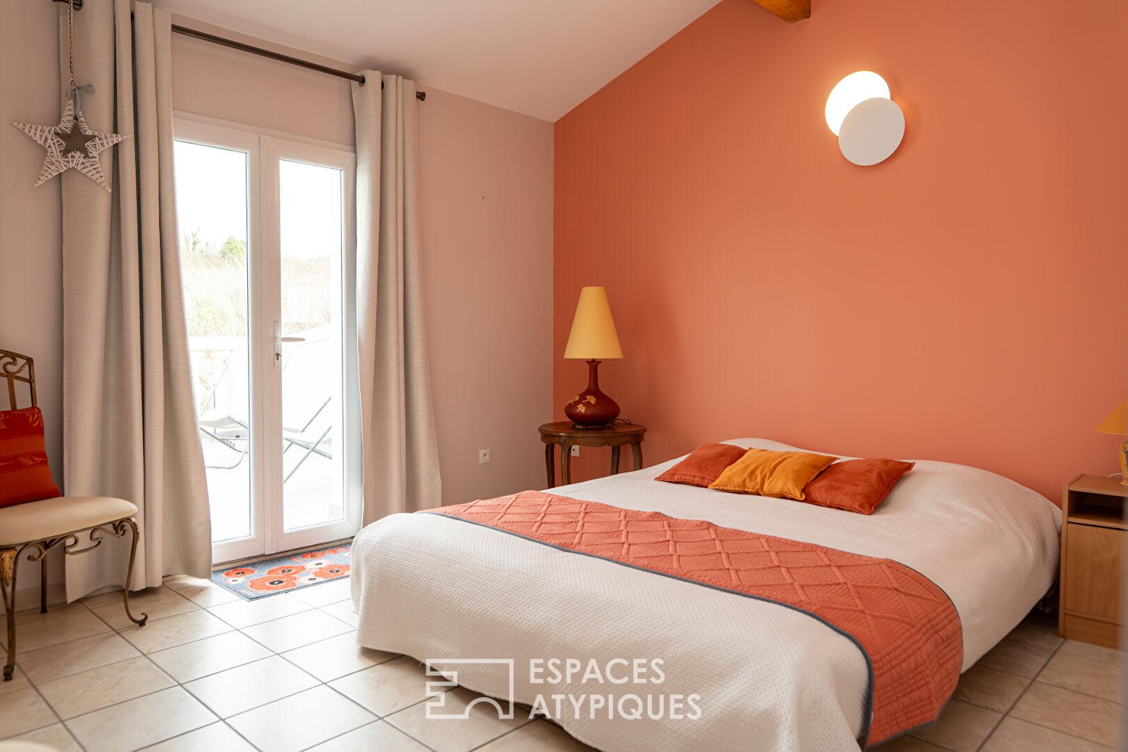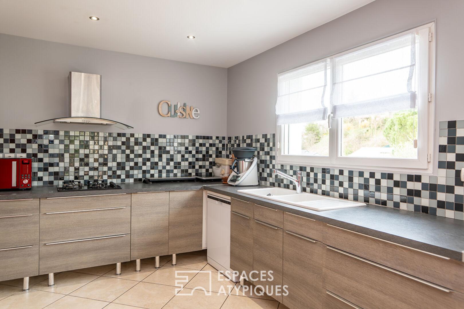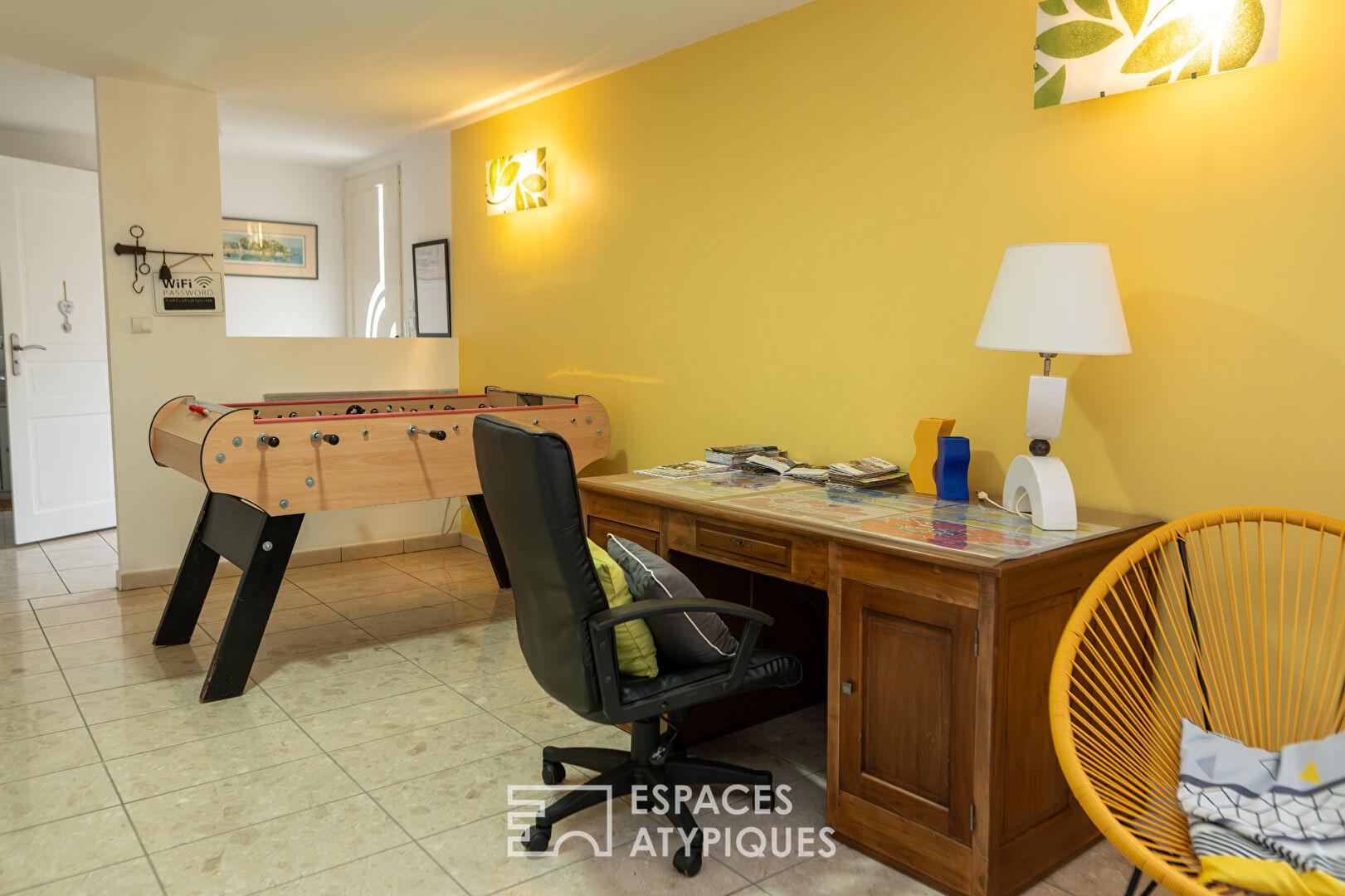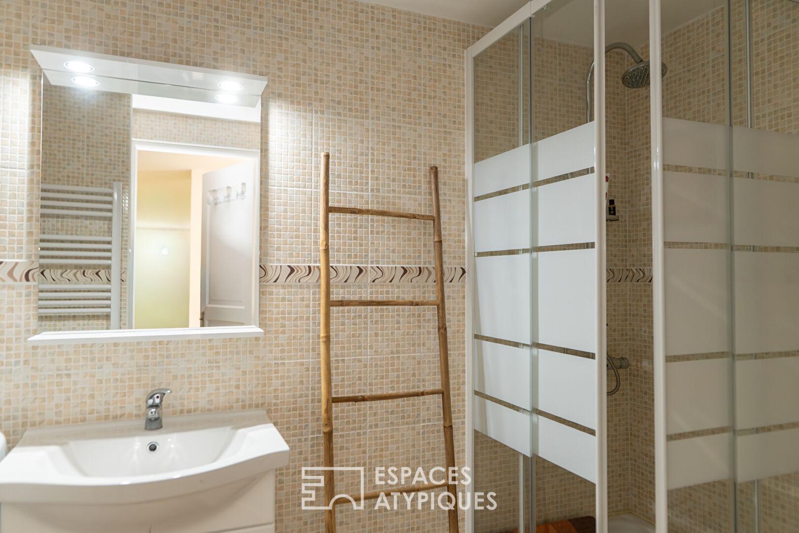 En rez de chaussée, un appartement indépendant de 100 m² composé d’une cuisine, un salon salle à manger et une chambre, complète cet ensemble, offrant une polyvalence rare pour un projet professionnel ou familial.