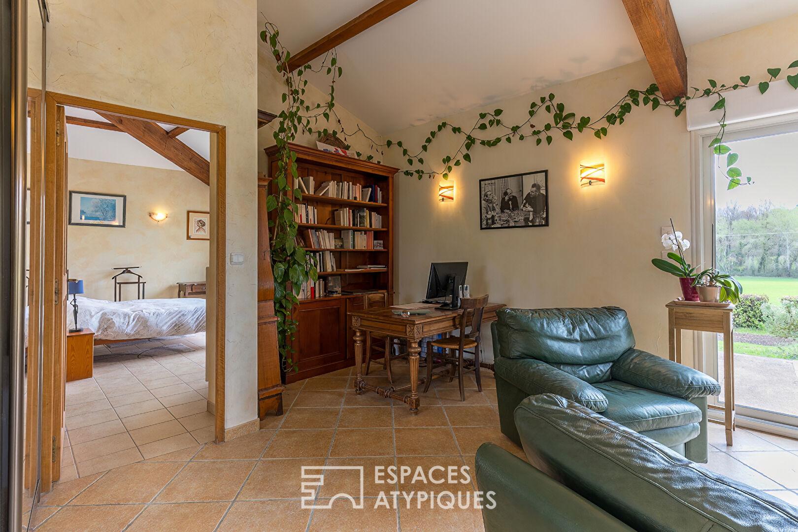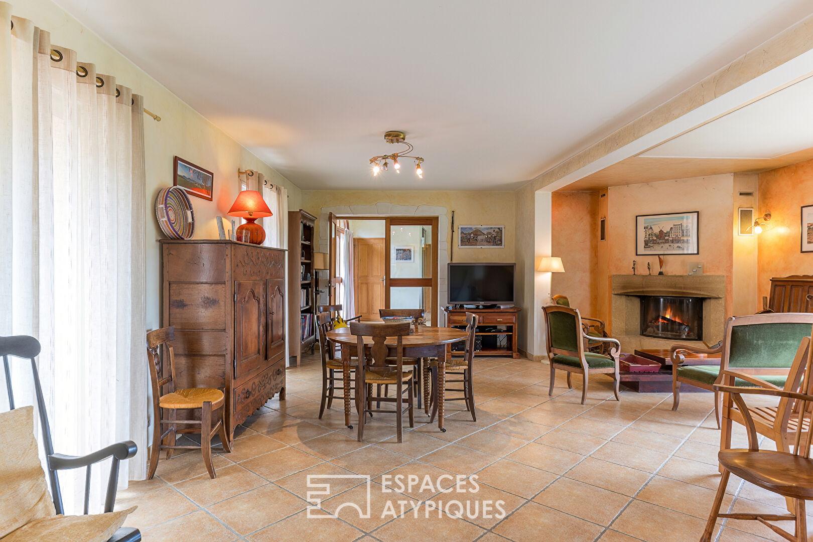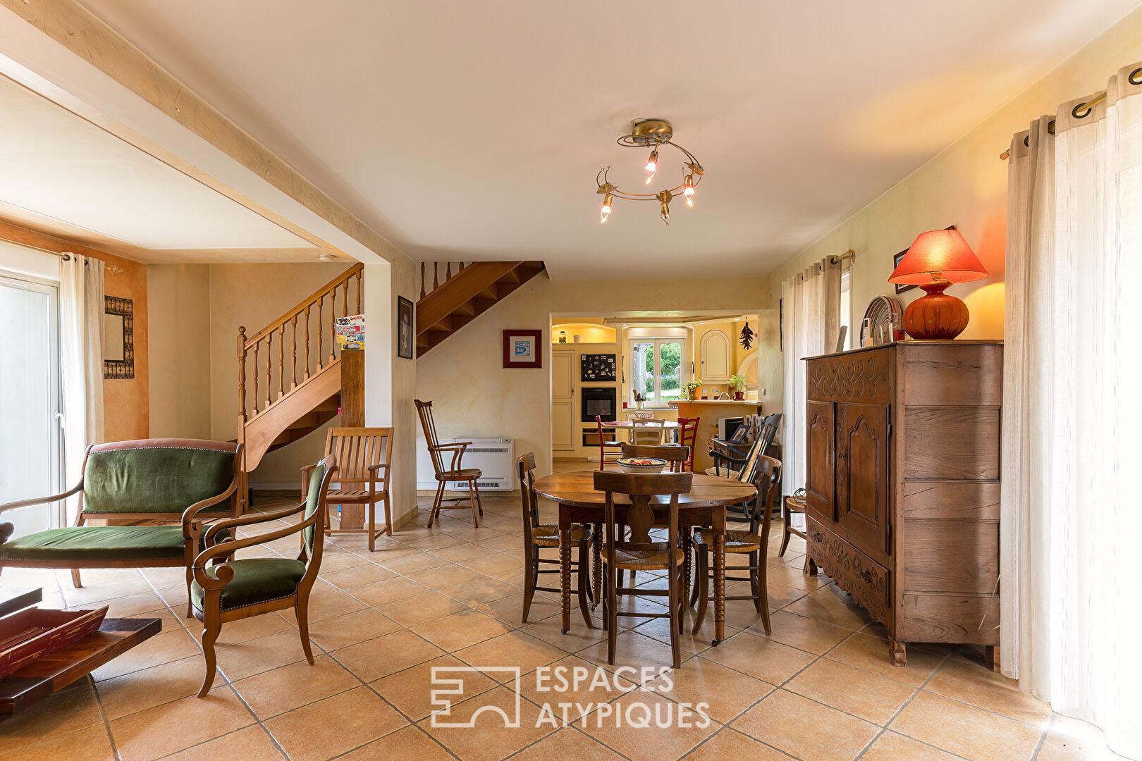 Les extérieurs, soigneusement arborés et paysagés avec diverses essences et un coin potager invitent au bien-être dans un cadre naturel apaisant, entouré de terres agricoles garantissant calme et sérénité. Plusieurs dépendances enrichissent ce bien : atelier, grande cave, espaces de stockage mais aussi un vaste hangar permettant de stationner à l’abri jusqu’à six véhicules, stocker des matériaux divers, un espace idéal pour un artisan ou une activité professionnelle à domicile.