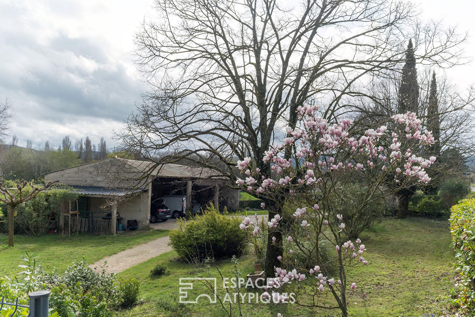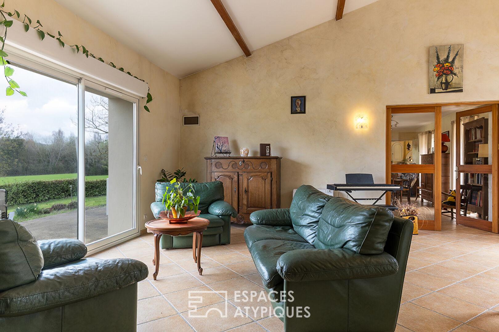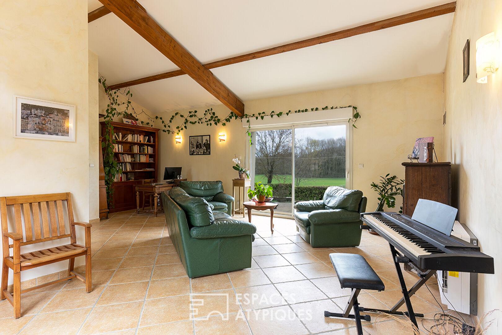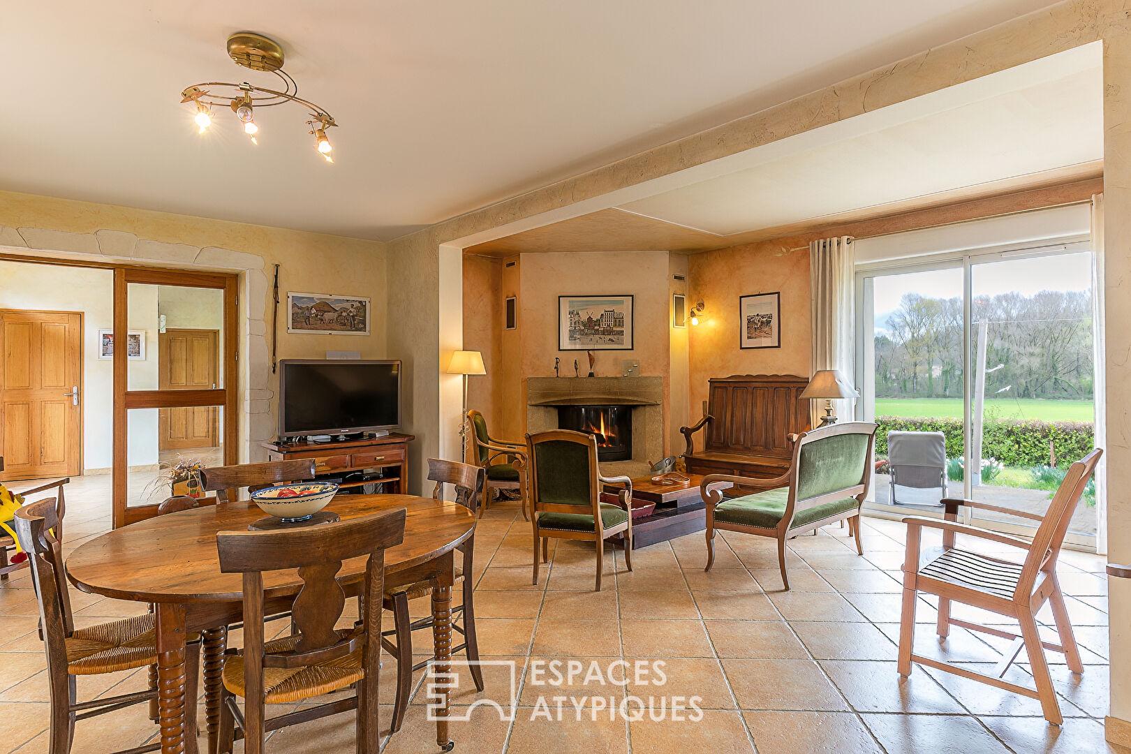 Les extérieurs, soigneusement arborés et paysagés avec diverses essences et un coin potager invitent au bien-être dans un cadre naturel apaisant, entouré de terres agricoles garantissant calme et sérénité. Plusieurs dépendances enrichissent ce bien : atelier, grande cave, espaces de stockage mais aussi un vaste hangar permettant de stationner à l’abri jusqu’à six véhicules, stocker des matériaux divers, un espace idéal pour un artisan ou une activité professionnelle à domicile.