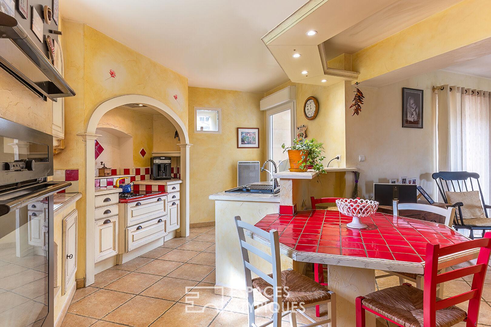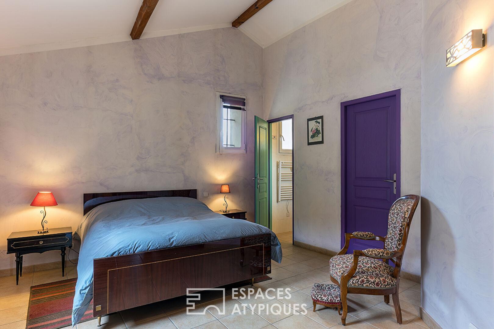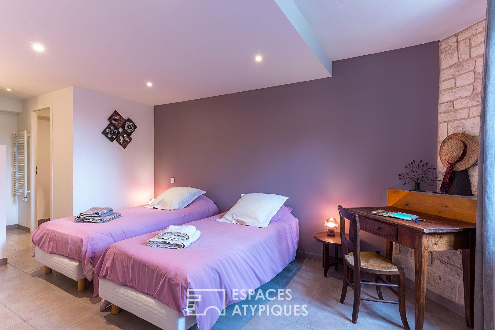 La maison principale, entièrement rénovée avec soin, séduit par ses volumes généreux et sa luminosité omniprésente. Élevée sur deux niveaux, elle propose en rez-de-chaussée un vaste espace détente et bureau ouvert sur les extérieurs une chambre avec salle d’eau privative et accès extérieur, ainsi qu’une belle pièce de vie , elle aussi avec accès sur la terrasse est agrémentée d’une belle cheminée insert. La cuisine, d’inspiration provençale s’ouvre naturellement sur la cour intérieure et s’accompagne d’un cellier/arrière-cuisine spacieux et fonctionnel.