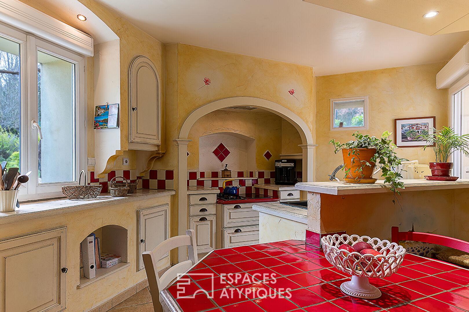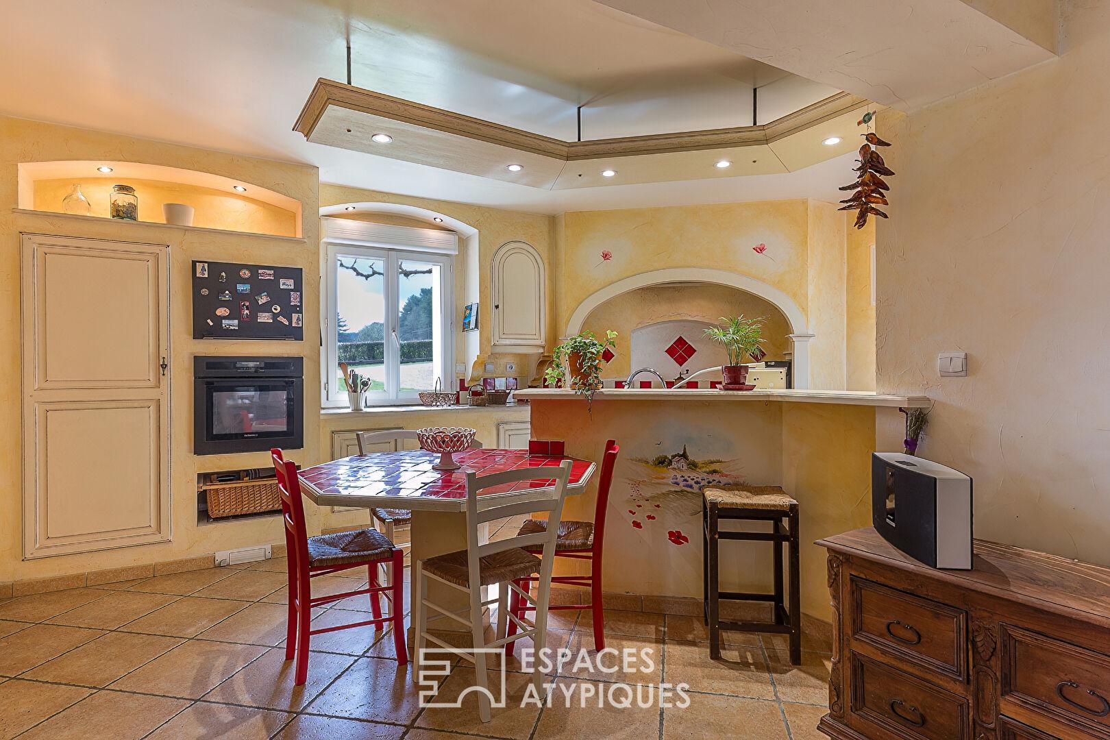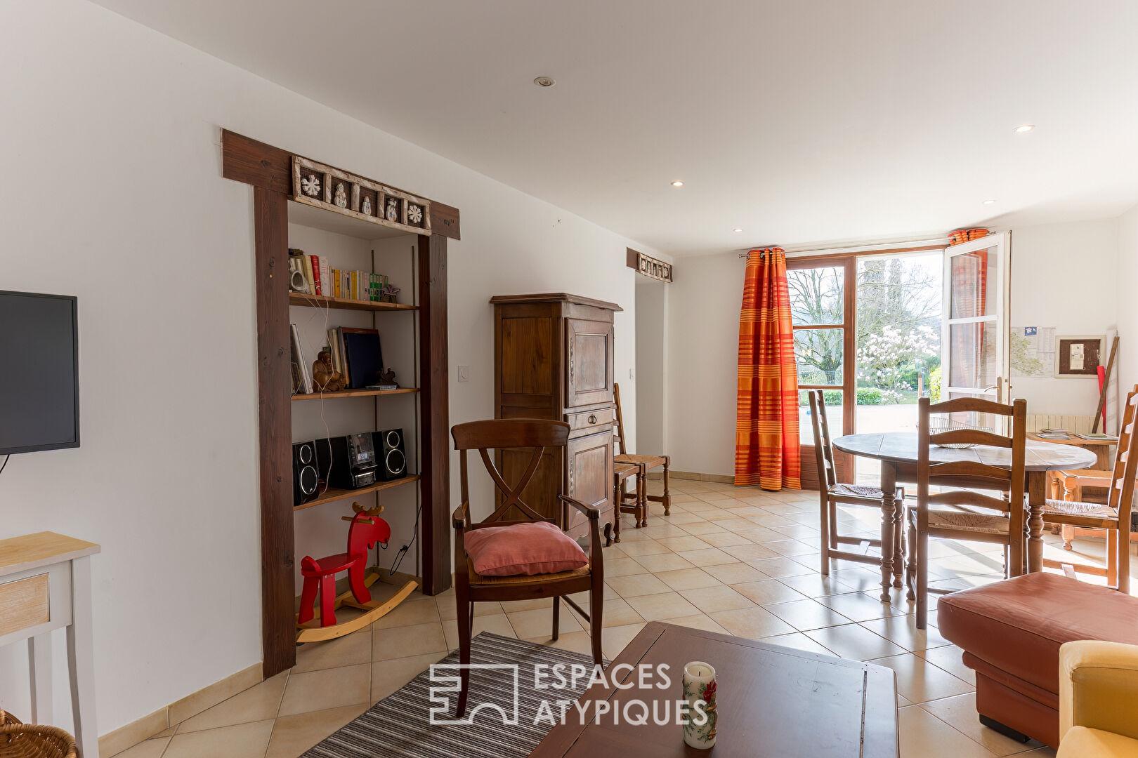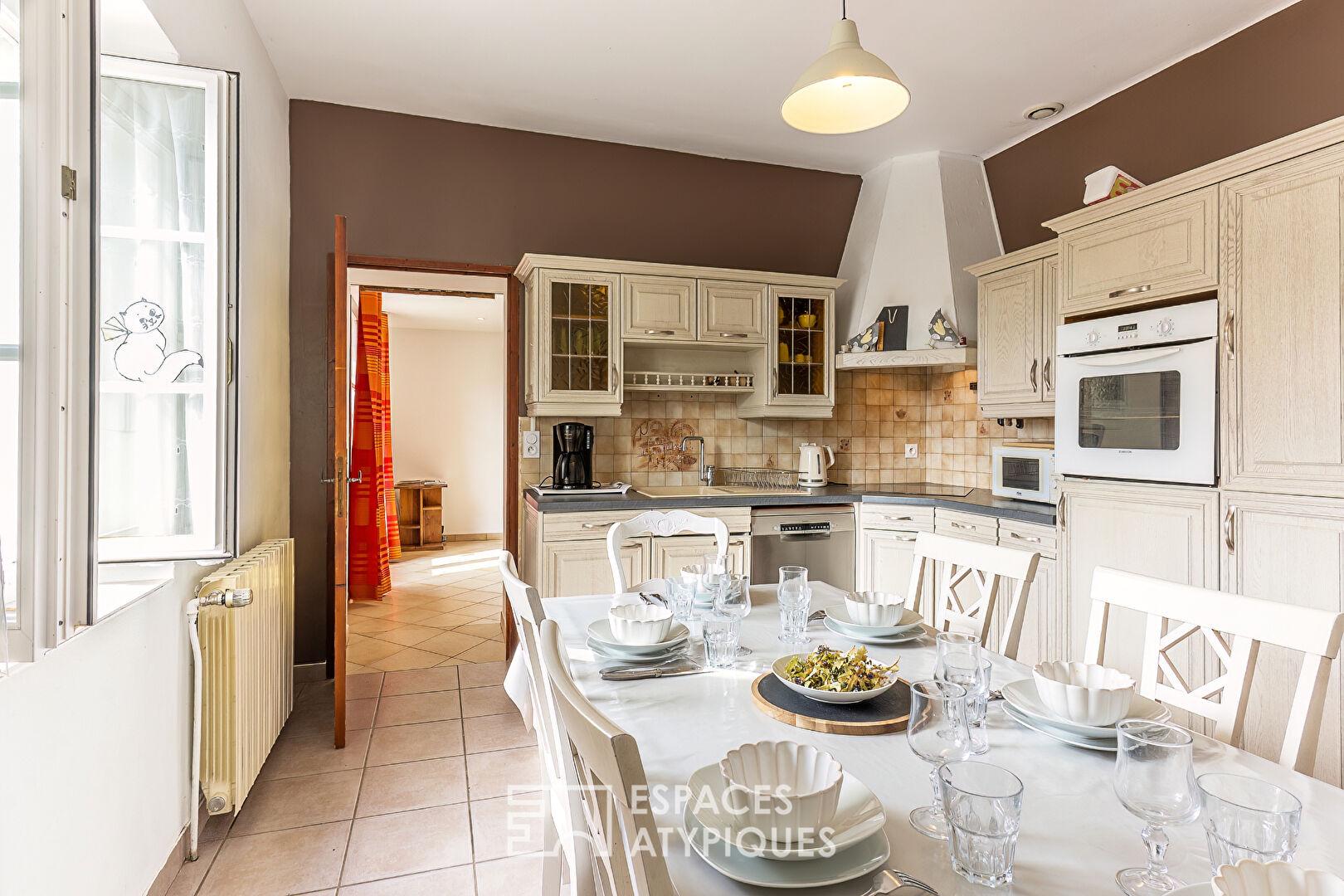 La maison principale, entièrement rénovée avec soin, séduit par ses volumes généreux et sa luminosité omniprésente. Élevée sur deux niveaux, elle propose en rez-de-chaussée un vaste espace détente et bureau ouvert sur les extérieurs une chambre avec salle d’eau privative et accès extérieur, ainsi qu’une belle pièce de vie , elle aussi avec accès sur la terrasse est agrémentée d’une belle cheminée insert. La cuisine, d’inspiration provençale s’ouvre naturellement sur la cour intérieure et s’accompagne d’un cellier/arrière-cuisine spacieux et fonctionnel.