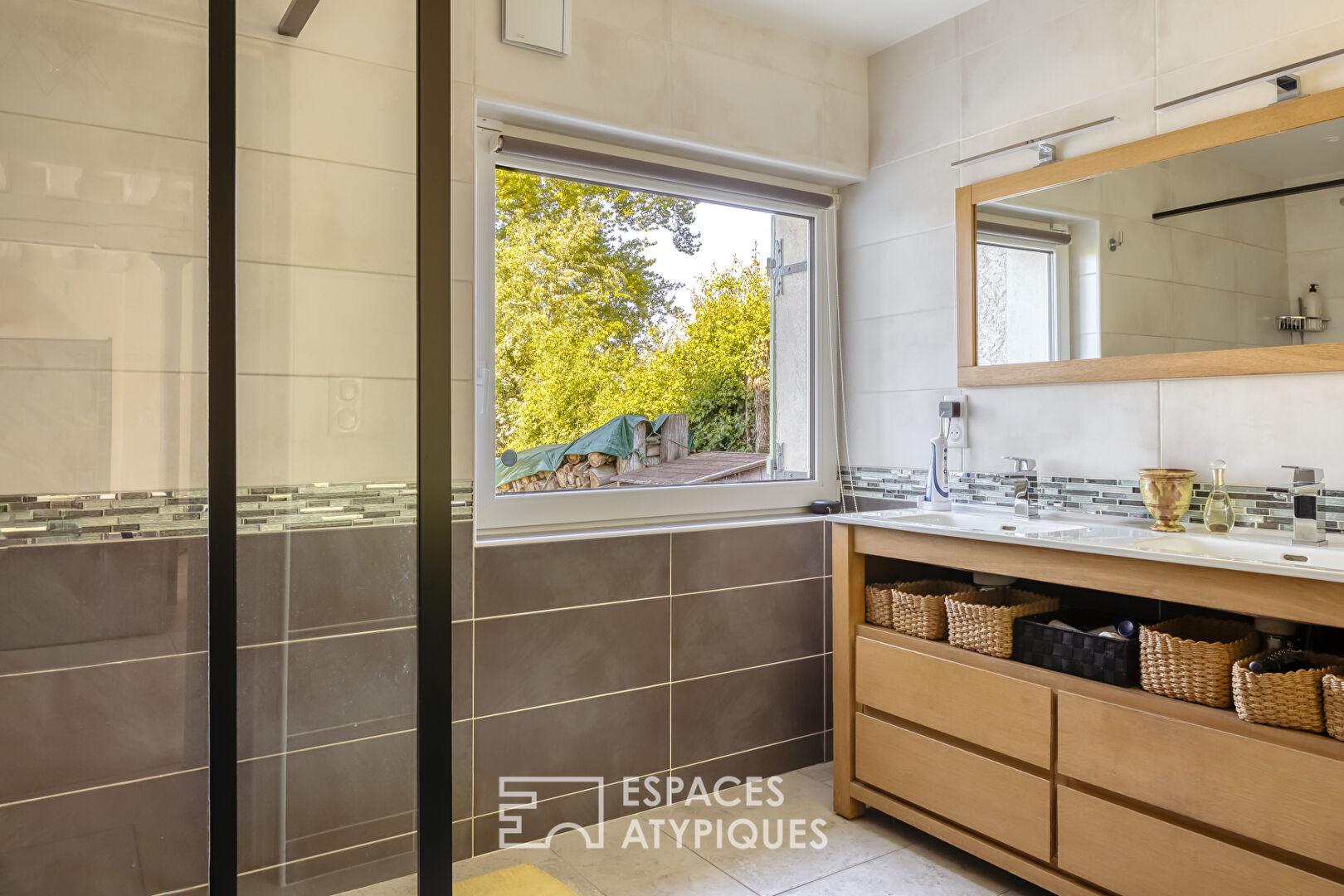 À l’extérieur, une terrasse de 70 m² invite à la contemplation d’un jardin paisible bordé de champs, où cohabitent écureuils et oiseaux.