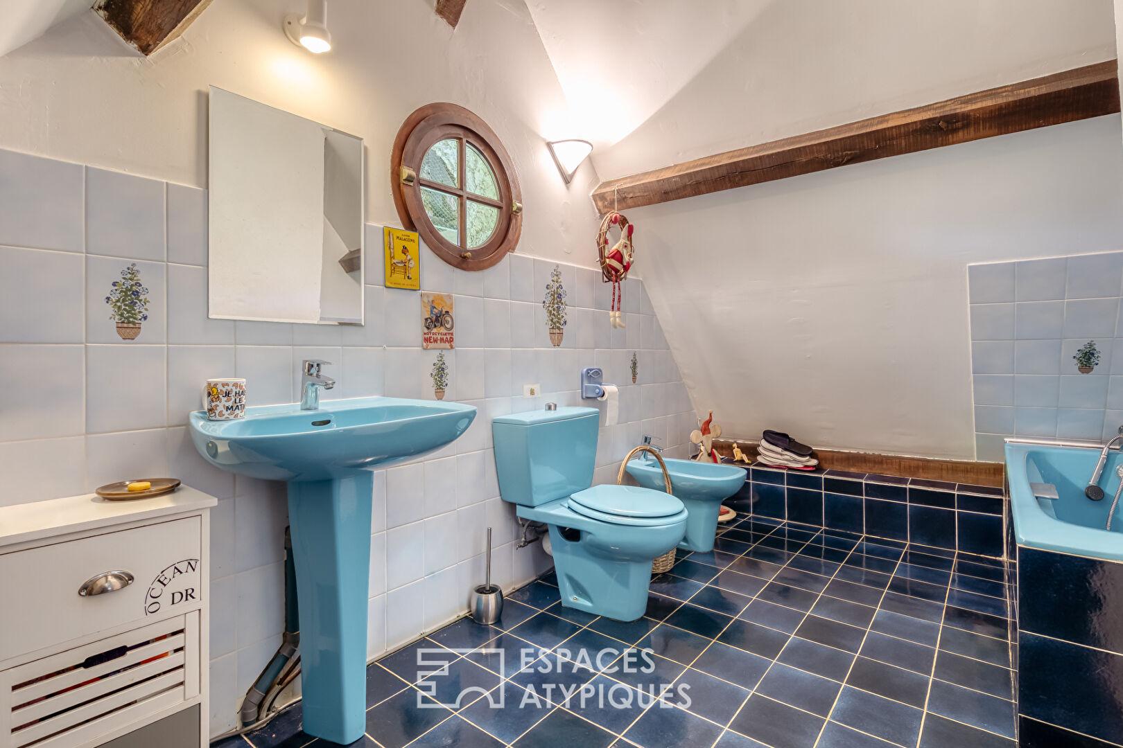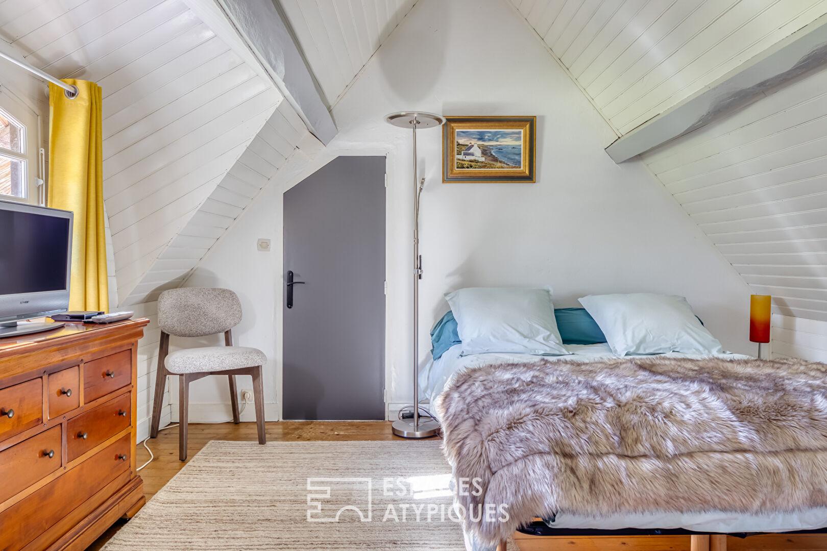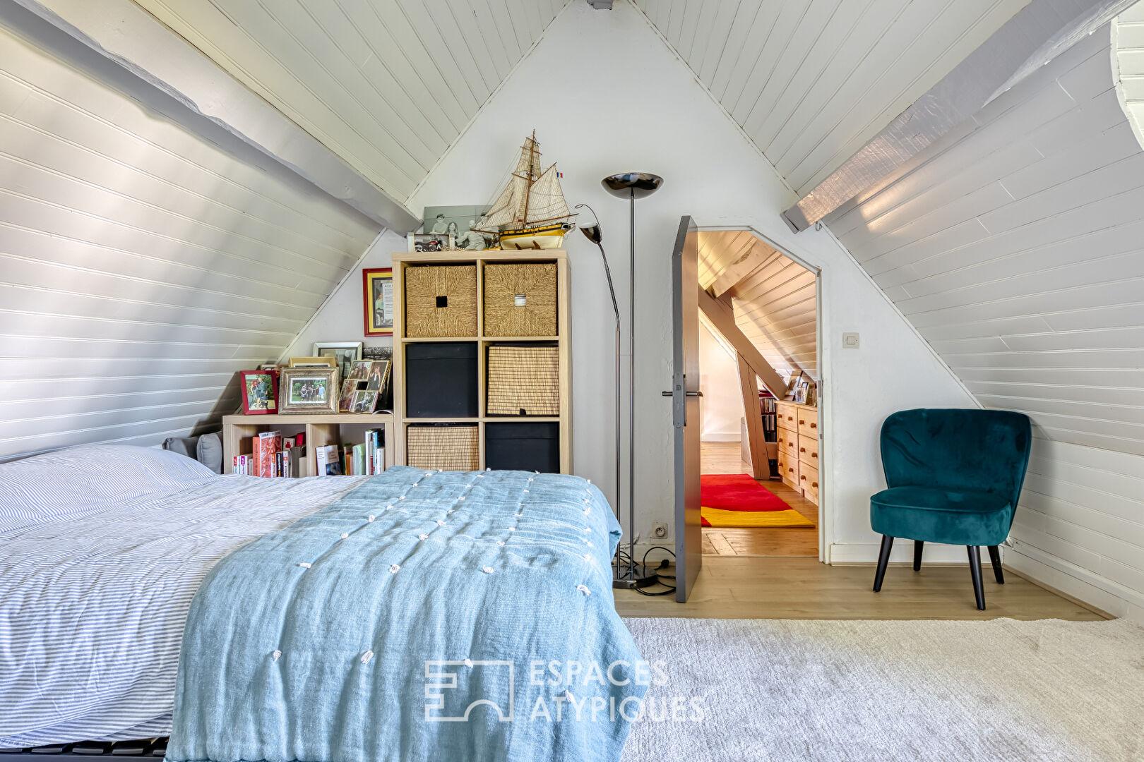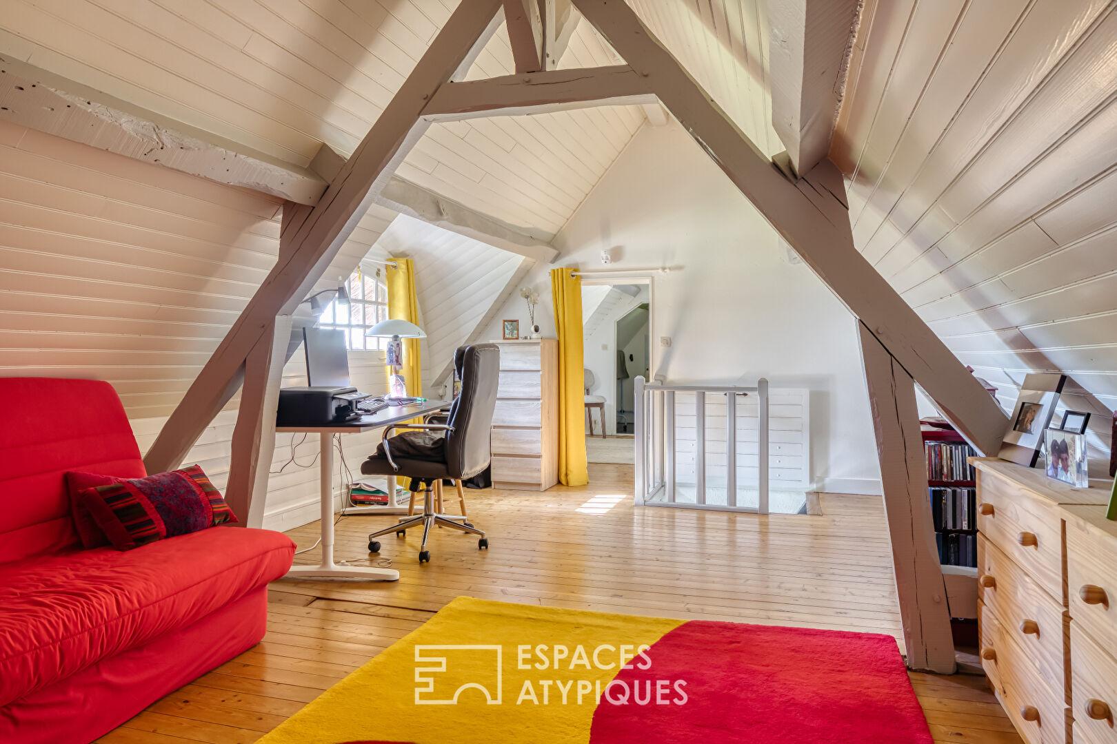 À l’étage, un palier polyvalent, idéal pour un espace de jeu ou bureau, dessert deux chambres supplémentaires, une salle de bain avec WC et un dressing parfaitement aménagé sous les combles.