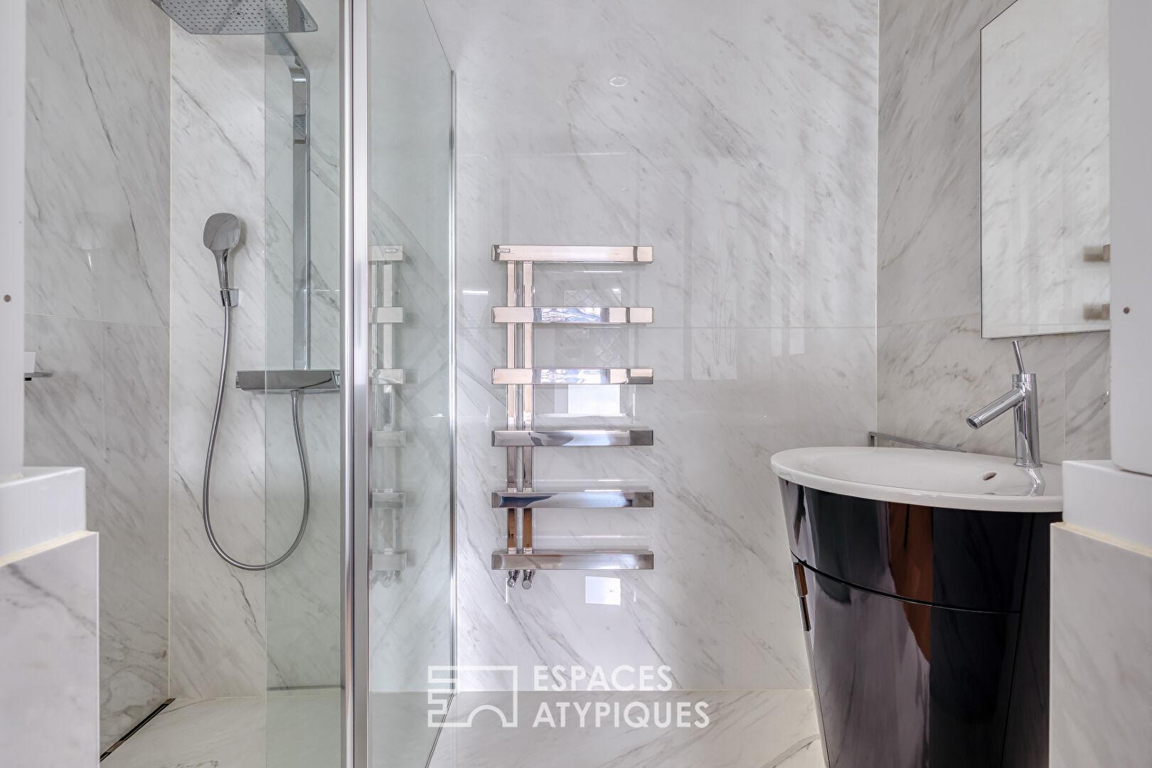 À l’étage, le salon cathédrale impressionne par sa hauteur sous plafond et sa luminosité exceptionnelle. Les larges ouvertures prolongent naturellement l’espace vers la terrasse, orientée sud ouest de 19 m² avec vue sur les toits créant un véritable esprit dedans/dehors. Une salle de bain aux finitions soignées se distingue par un jeu de miroirs et est complétée par une douche et un WC.