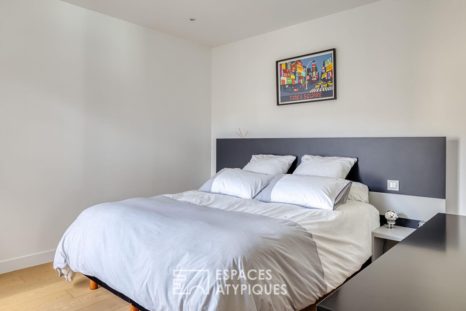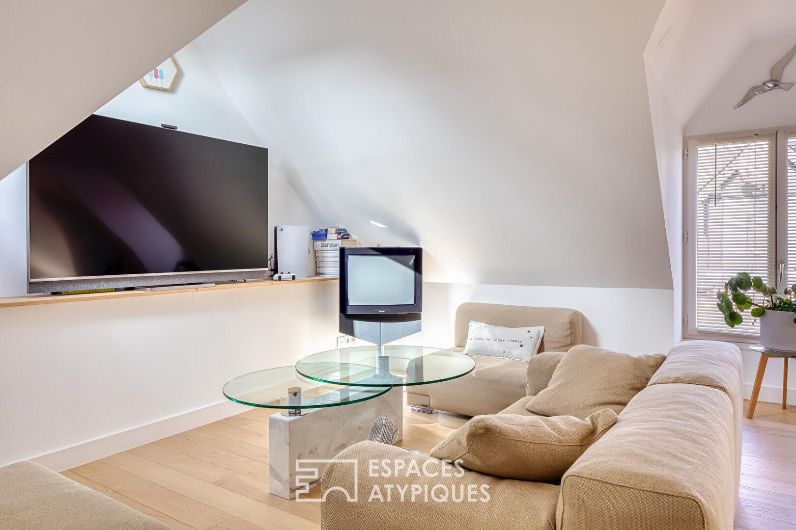 Au dernier niveau, la mezzanine, sublimée par ses garde-corps en verre, accueille un espace bureau et une belle pièce aménagée en chambre et salle de cinéma, pouvant également recevoir aisément deux enfants.