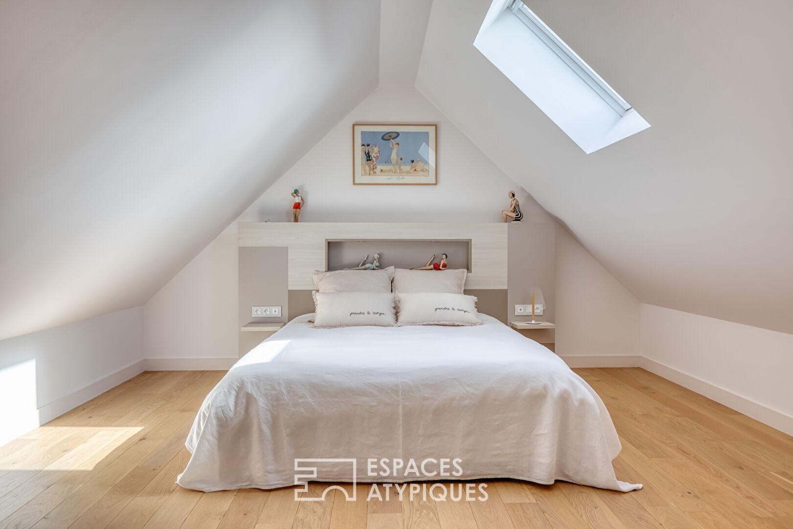 Dès l’entrée, le regard est capté par un escalier sur-mesure en bois, réalisé par un ébéniste local, intégrant des rangements et des WC. L’espace de vie s’articule autour d’une cuisine aux lignes épurées, avec îlot central, équipée d’un électroménager SMEG (four vapeur, four combiné, cave à vin). Ce lieu de convivialité s’ouvre sur une terrasse de 7m². Deux chambres prennent place sur ce niveau, dont une avec sa salle de douche, sublimée par une élégante verrière industrielle.