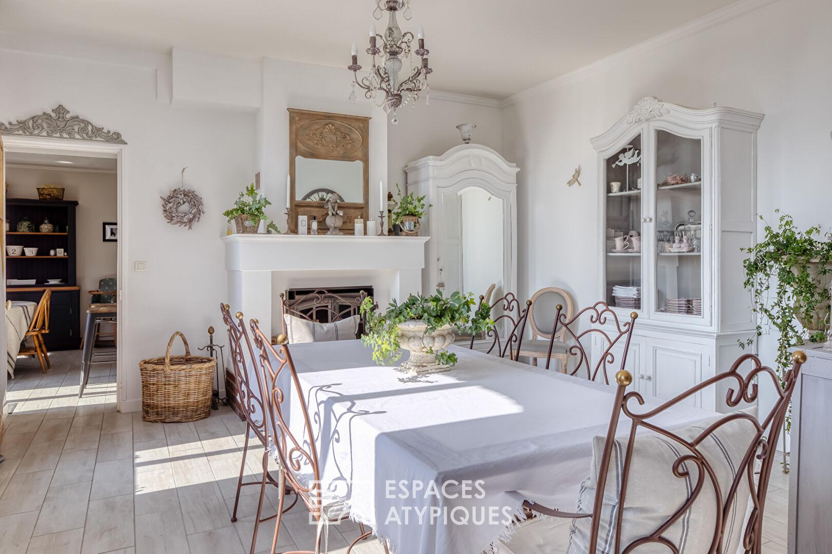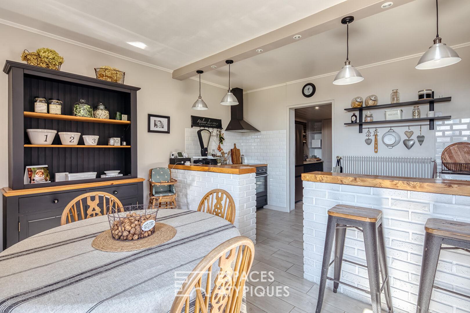La vaste salle de réception déploie un espace chaleureux où les volumes invitent naturellement aux moments de partage. Les pièces de vie s’organisent avec fluidité autour d’une agréable cuisine dînatoire, véritable coeur battant de la maison.