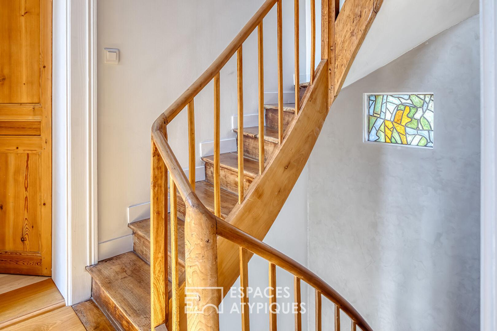 Les poutres, la cheminée et l’escalier en bois composent un décor chargé d’histoire, subtilement mis en valeur par la lumière naturelle.
