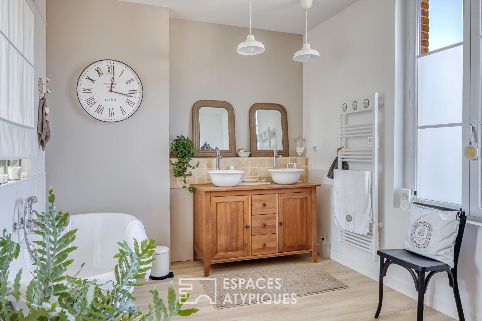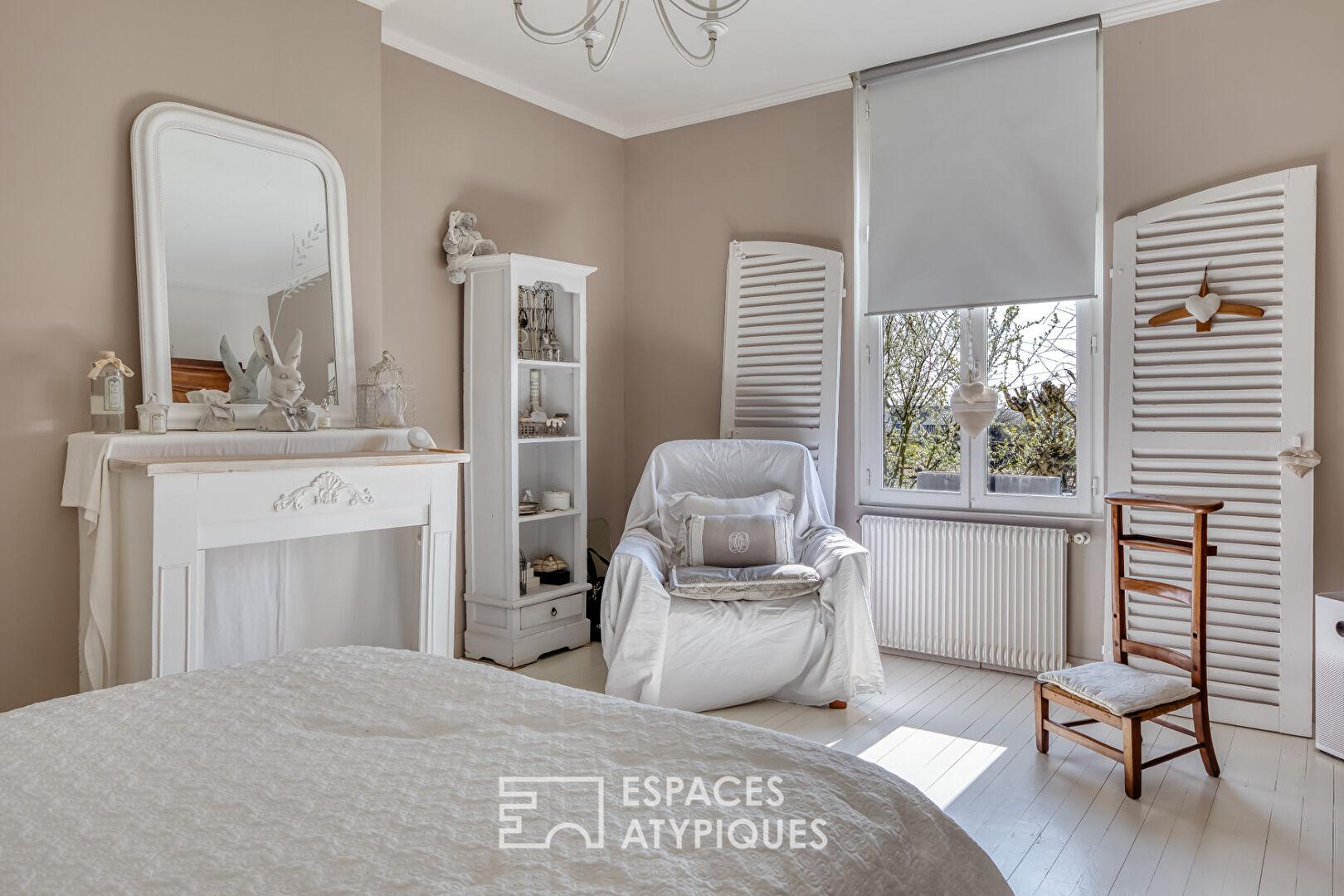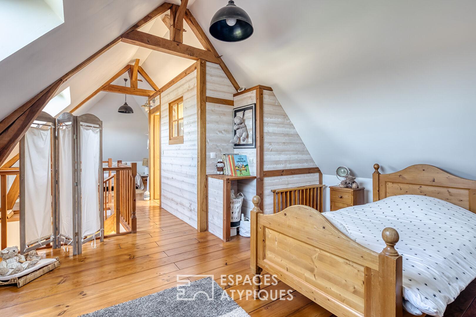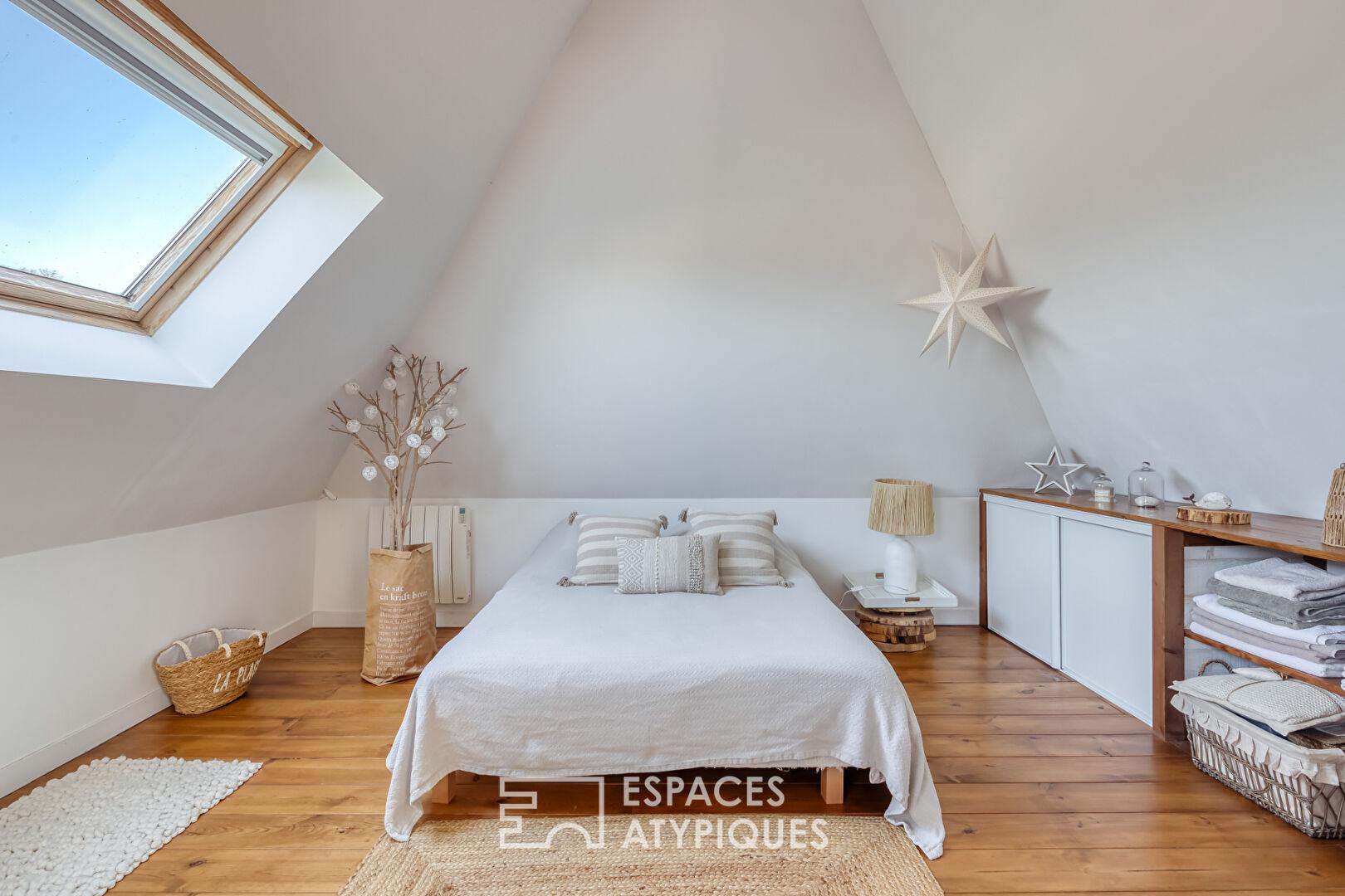 À l’étage, les quatre chambres offrent une ambiance douce et feutrée, propice au repos, tandis que les deux salles d’eau apportent confort et fonctionnalité à l’ensemble.