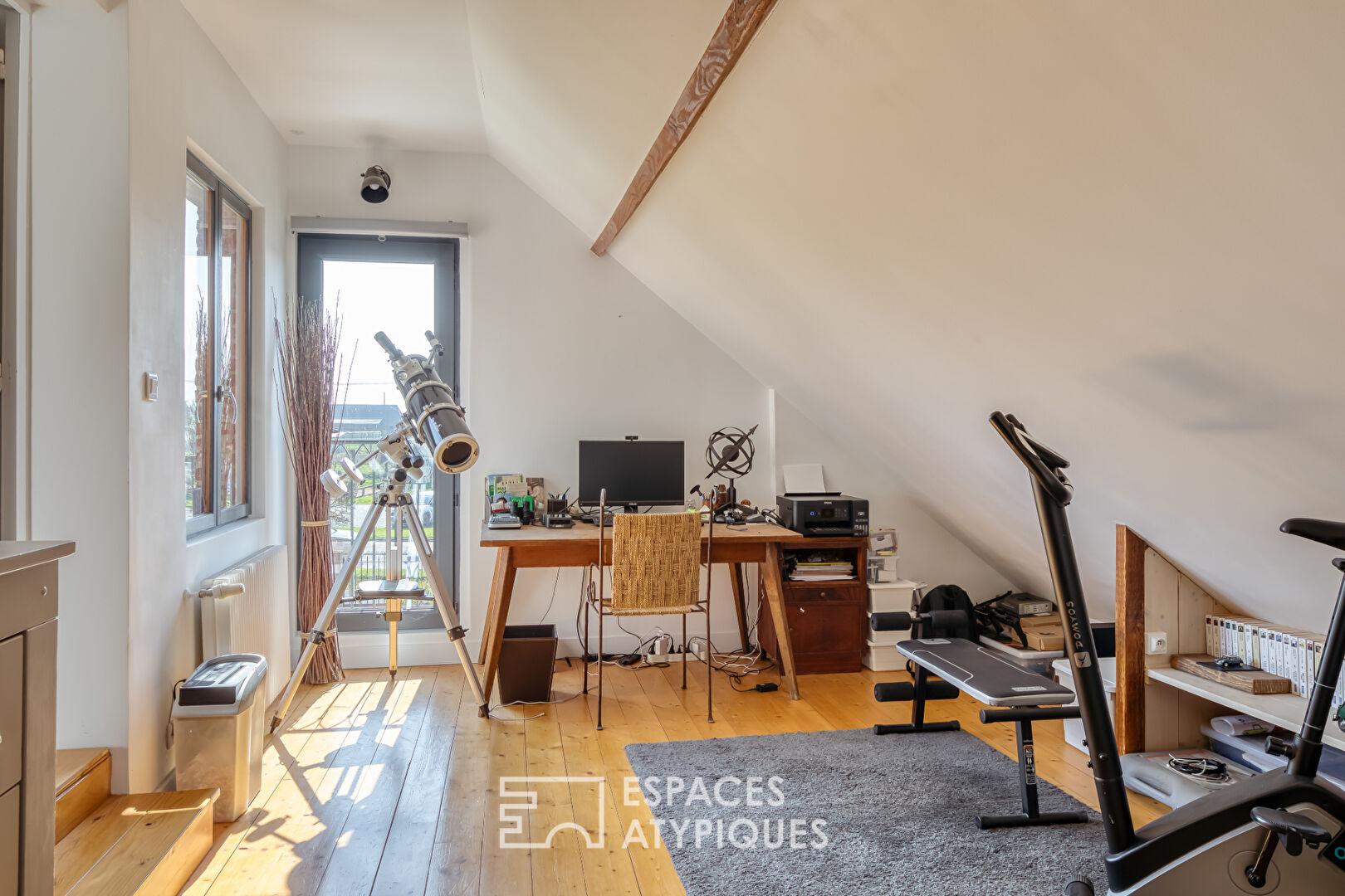 Au coeur du village de La Haye-du-Theil, à proximité et 10 min du prestigieux Château du Champ-de-Bataille et de son renommé Golf du Champ de Bataille, cette ancienne boulangerie du XIXe siècle entièrement réinventée se déploie sur environ 170 m² habitables.