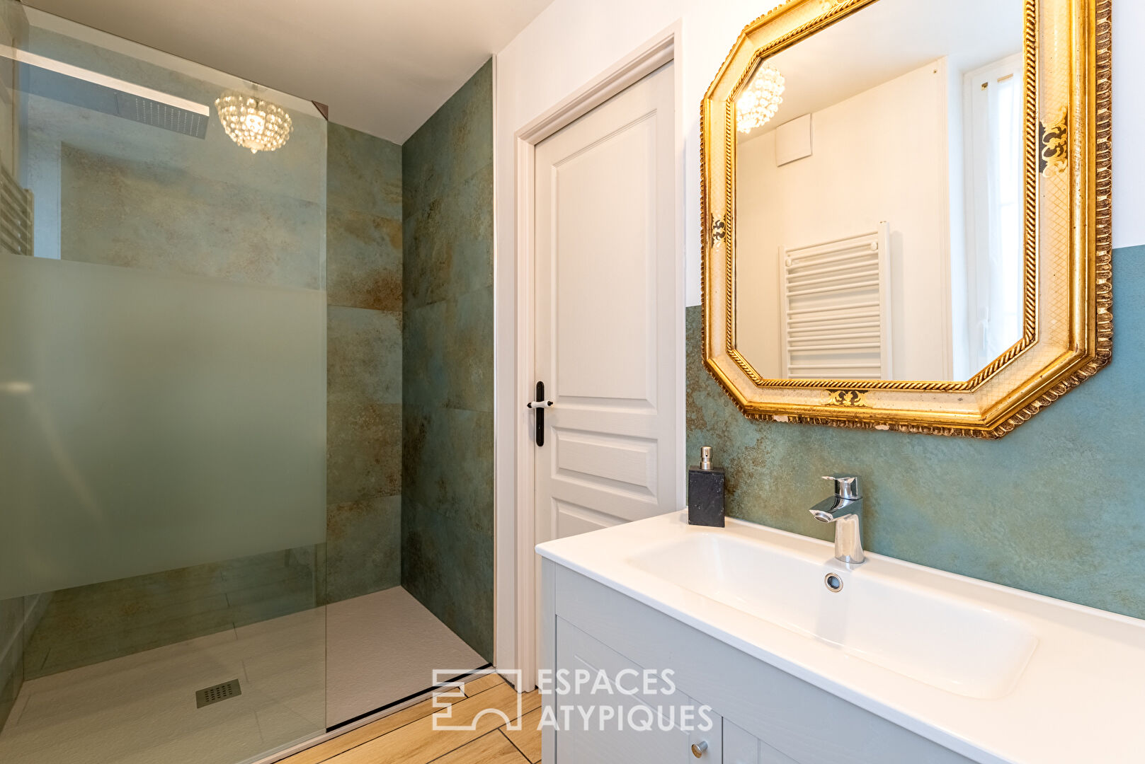 Au rez-de-chaussée, le visiteur est directement accueilli par une cuisine contemporaine et élégante, offrant désormais une belle profondeur sur le salon et la salle à manger après avoir ouvert le mur de séparation d’origine, repris à la chaux depuis.