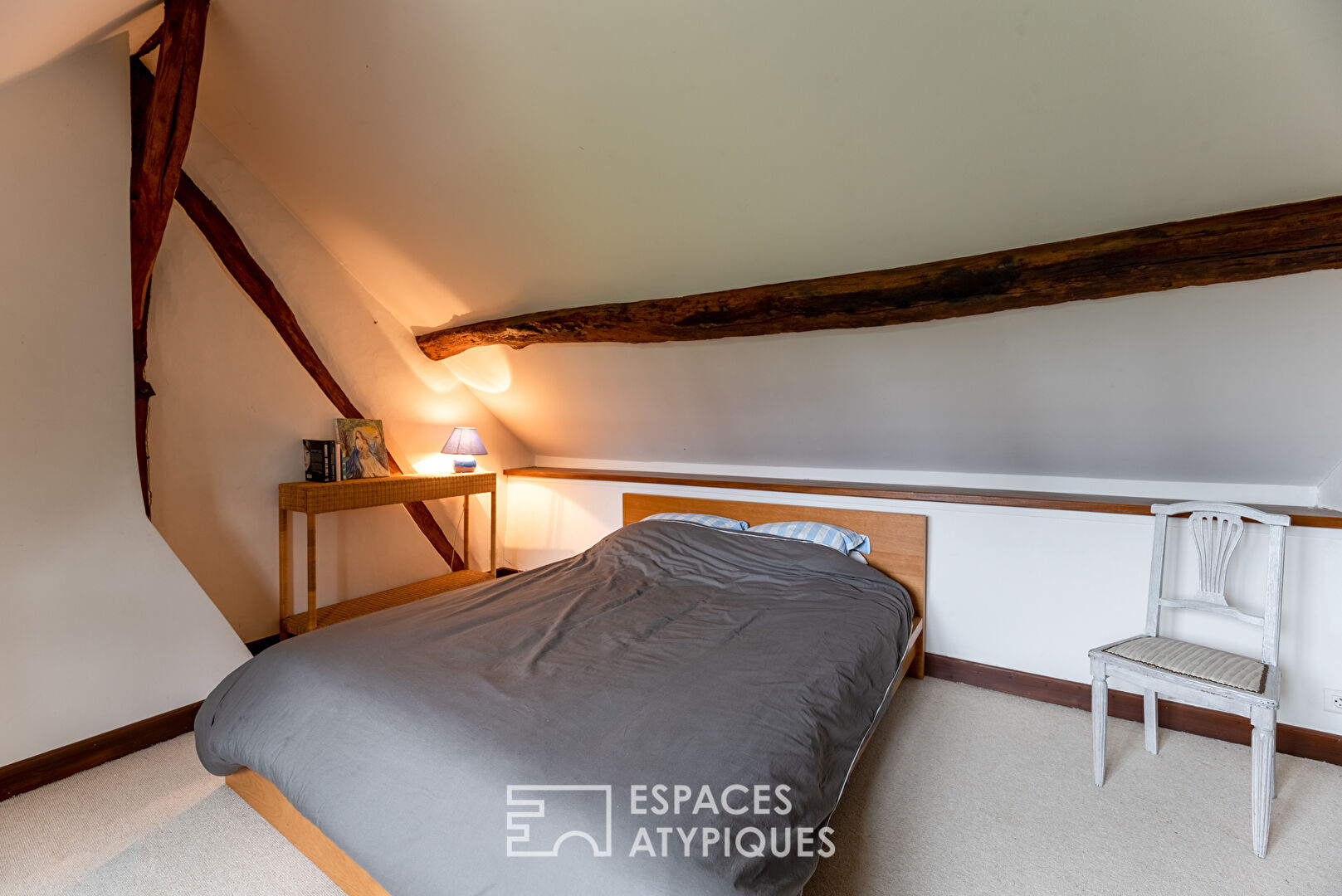 A l’ombre d’un magnifique hêtre centenaire, cette élégante longère dont la façade s’orne d’une glycine au parfum délicat donne tout son sens à l’expression « voir la vie en vert ».