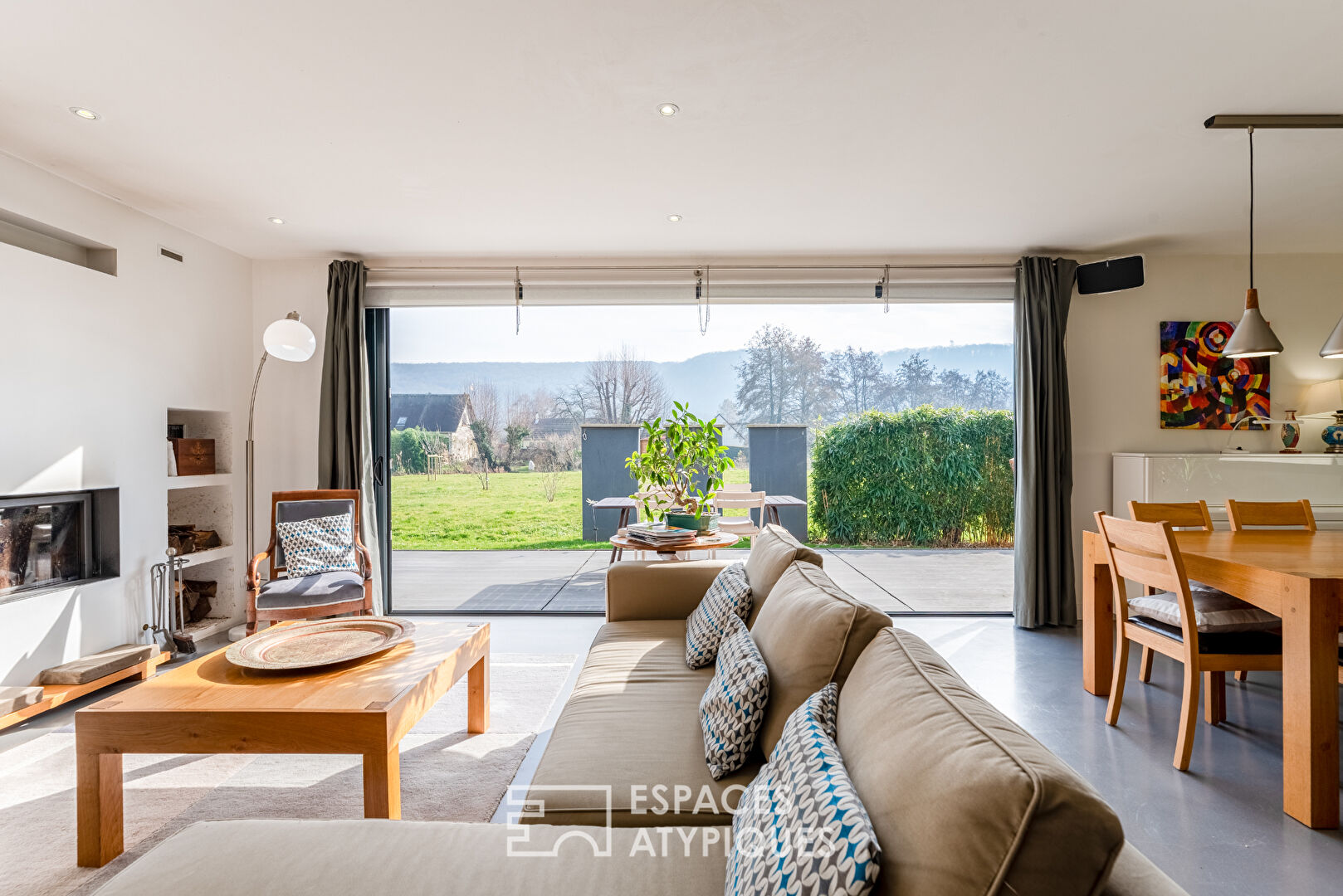 C’est précisément à Romilly au bord de l’Andelle, non loin des meuneries d’antan que cette maison d’architecte construite en 2013 sur une parcelle de 1500m² traversée par un ruisseau, trône fièrement.