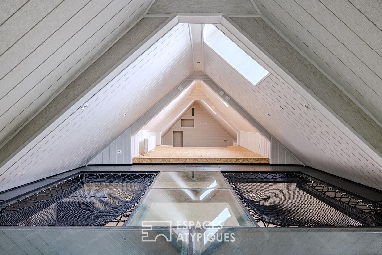 À l’étage, l’organisation est pensée pour le confort et la singularité : une suite parentale complète (bains, dressing, WC) côtoie deux chambres supplémentaires, un coin bureau et une vaste salle de douche avec WC. Un couloir buanderie optimise l’espace. Les volumes se révèlent sous une charpente en partie apparente, où une salle de jeux parfaite pour les amateurs de judo précède un dortoir surprise niché sous les combles (ou une quatrième chambre), accessible par un plancher de verre.