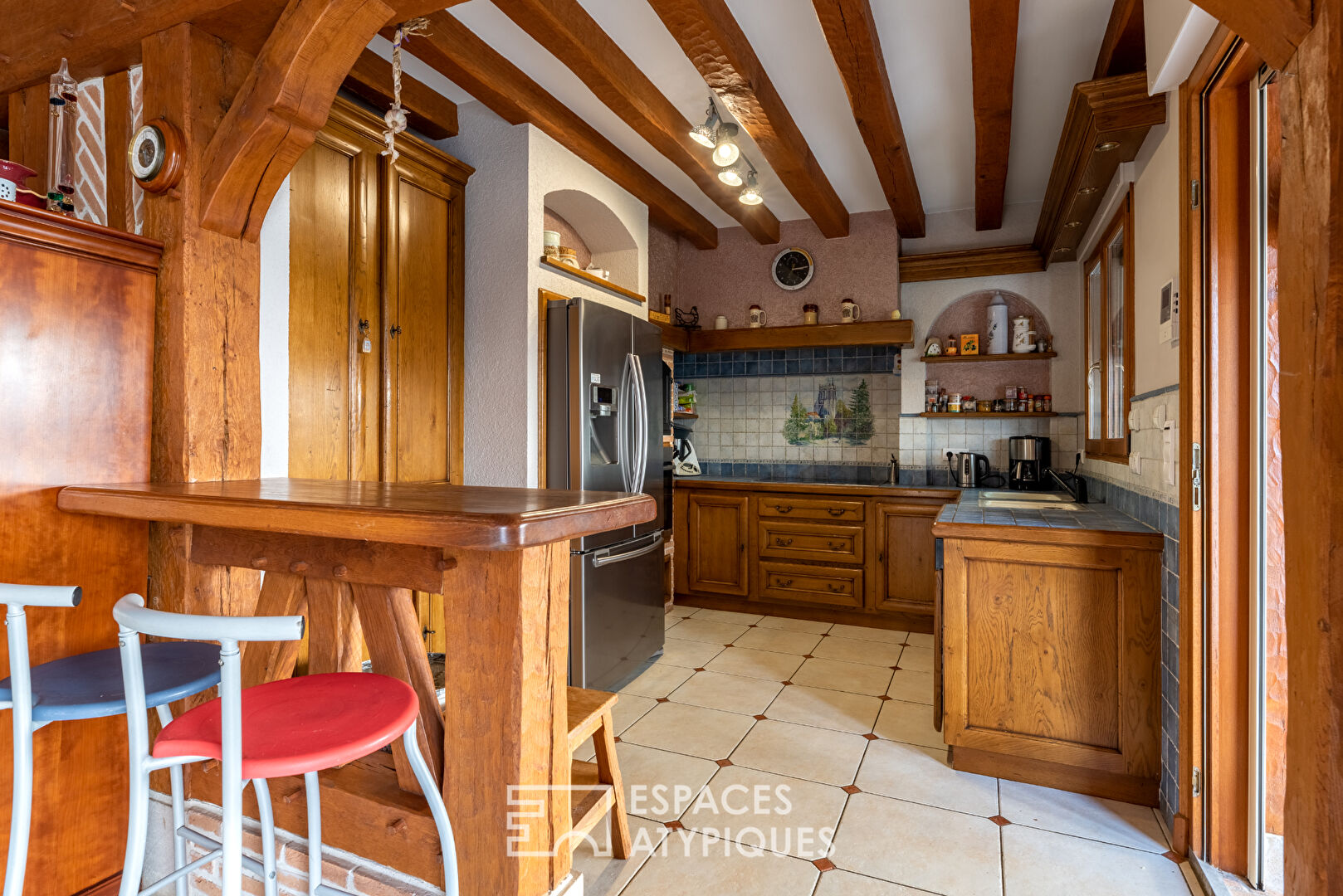 La bâtisse orientée plein sud offre 6 pièces dont une très chaleureuse pièce à vivre ornée d’une belle cheminée, de grandes baies vitrées et de poutres majestueuses assemblées aux techniques d’antan ouvrant sur une somptueuse véranda chauffée.