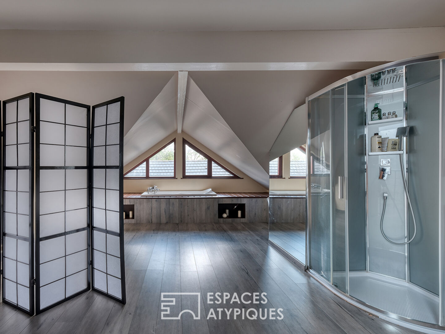 Au calme, la vaste suite parentale d’environ 36m2 se compose d’une chambre donnant sur la terrasse, d’une salle de bains avec douche et baignoire ainsi que d’un très grand dressing.